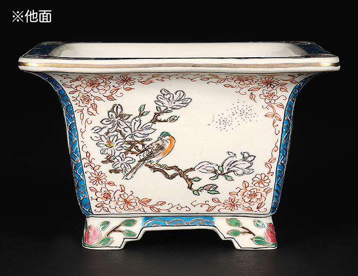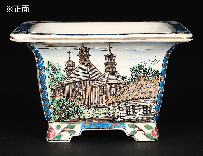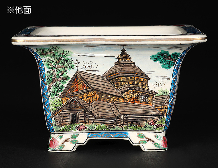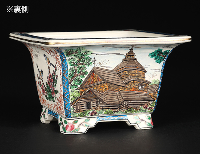 盆栽鉢には珍しい西洋の風景が描写された作品。伝統的な花鳥図も二面に描かれており、樹に合わせて使い分けが可能。
