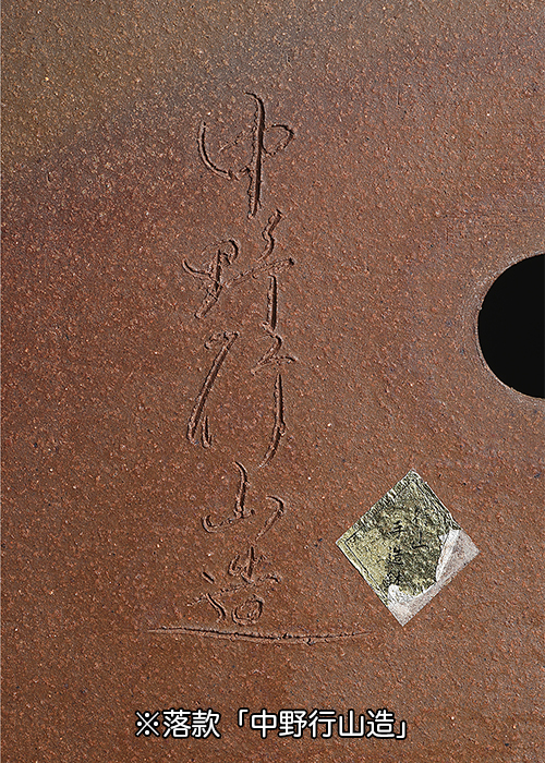 窯変によって土目の色調に変化が見られるが、これは行山がこだわる「火変わり」の妙味であり、時代が乗るごとに唯一無二の味わいを呈する。丸みを帯びた柔らかな形状が樹を上品に引き立てる手作り鉢の逸品。落款:中野行山造