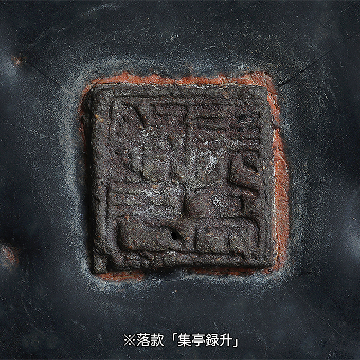 ◆現代でも難しいとされる天目釉の再現に成功した、著名愛石家でアマチュア陶工の水府散人。本器にも天目釉特有の美しい斑紋が浮き上がり、その味わいが堪能できる。型・寸法ともに理想的なバランスで使い勝手も最高の逸品。薬ムラやピンホールあり。木箱付。落款:集亭録升