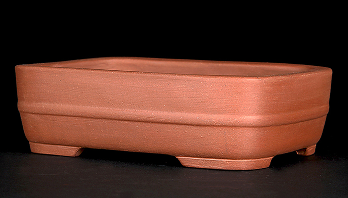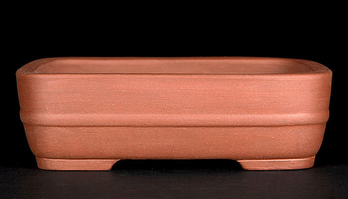 柔らかなラインの撫角型に胴紐の意匠がよく映える長方鉢。松系の優しい模様木や真柏や杜松にも使えます。サイズ感よく使い勝手の良さが魅力。