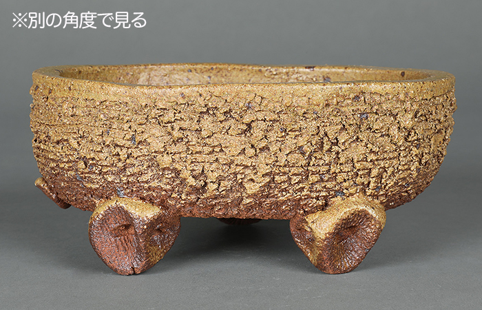 伊羅保釉は高麗茶碗の一種で侘びた佇まいと素朴な釉調が特徴です。この作品も同様に表面が粗めで黄色・茶系をベースに色調の変化が楽しめる作品です。デザインは三つ足の楕円型で素朴な味わいが魅力です。山野草の寄せ植え、創作盆栽などに最適です。