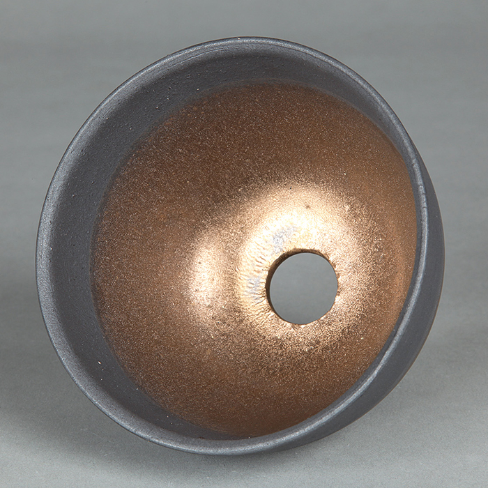 金色のテカリを抑えた釉薬をベースに上部は同じく黒のテカリを抑え釉薬を施したツートンカラーの洒落た丸鉢。小品盆栽、ミニ盆栽、山野草の単植え、寄せ植えと幅広く使えます。