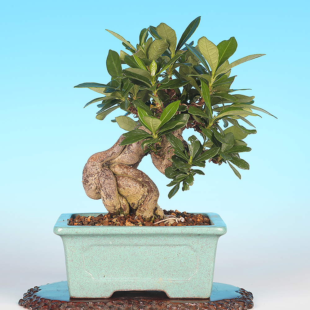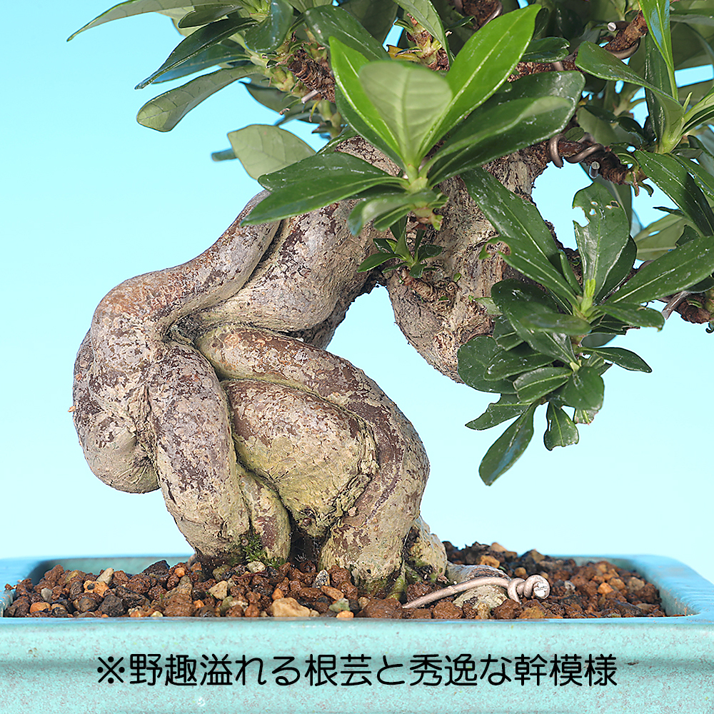 根上りの芸が魅力のくちなしの小品盆栽素材。根が癒着してゴツゴツと野趣に富んだ幹味となっています。幹肌の時代感も秀逸です。計画的に小品盆栽として作り込まれてきた素材だけにサイズ感も抜群。立ち上がりに迫力があり、幹中程の模様も見所です。この幹模様を活かして本格的な模様木に仕立てるのもよいでしょう。今年は実は成っていませんが、枝づくりを優先してもう1〜2作すれば大舞台も夢ではない逸材です。