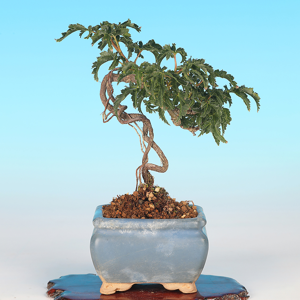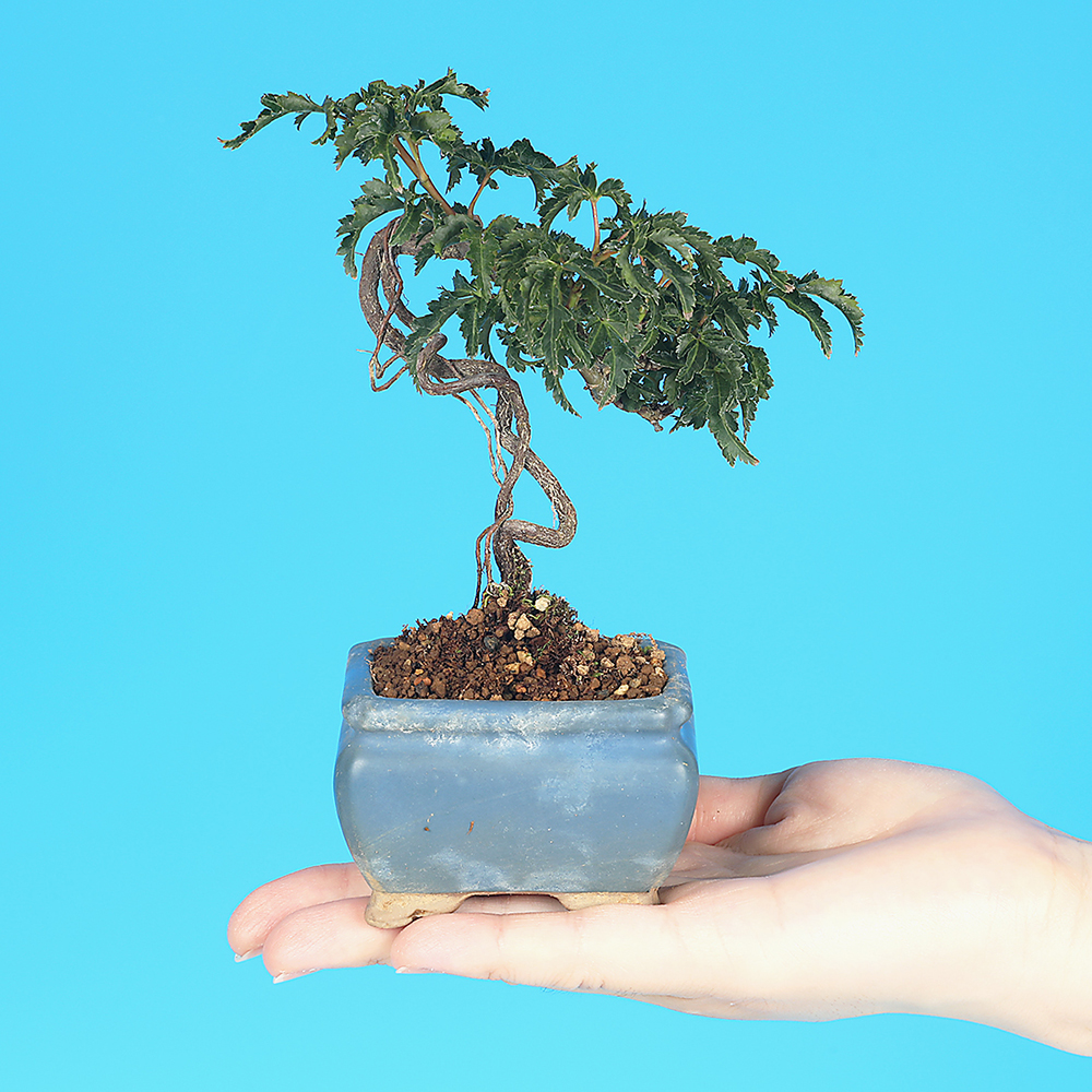 もみじ〔獅子頭〕の貴重な実生素材。これら葉性に特徴のある品種は、100%親木の性質を受け継ぐことができる挿し木で殖やすのが一般的です。ところがここに紹介した樹は実生8年生。ミニ盆栽として計画的に作り込まれた素材で根上がりの芸や細かな幹模様は、実生樹ならではの魅力が凝縮されています。掌に収まる樹高10㎝前後の寸法も極めて珍しく、ミニ盆栽愛好家必見の逸品です。