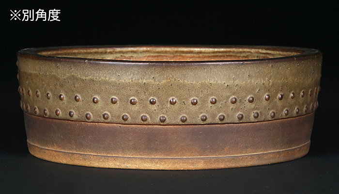 鋲打丸鉢としては深さがあり、大変珍しい型。かなり古い時代に焼成された作品のようで、元の色調が分からなくなるほどの時代乗りを見せる。縁に小さなホツレあり。水抜き細工なし。落款:三琇一陽