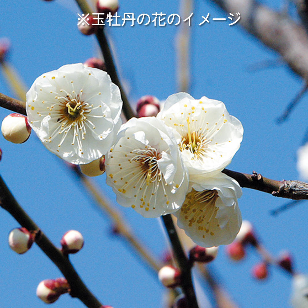 梅の盆栽素材。花底緑色の白色大輪花が美しい「玉牡丹」。中の弁が小さいので平たく見栄えの良い花です。プラ鉢入。