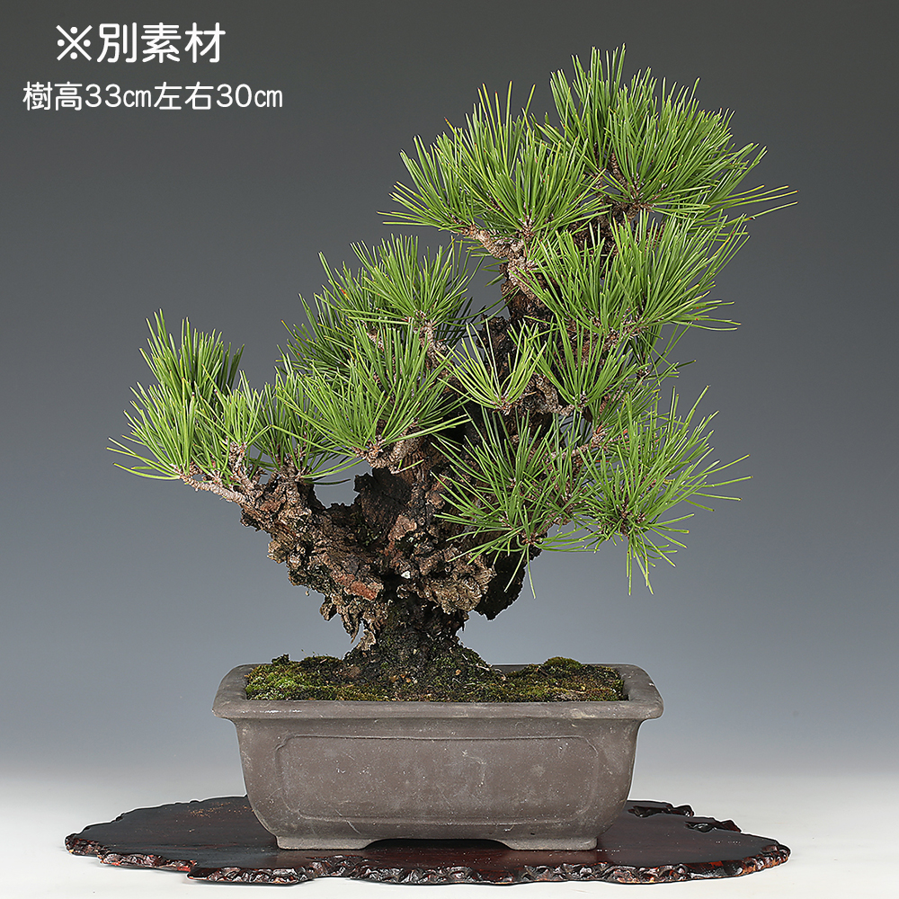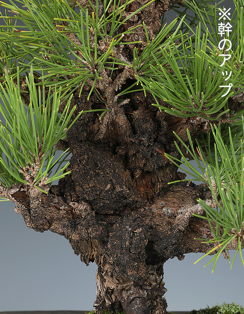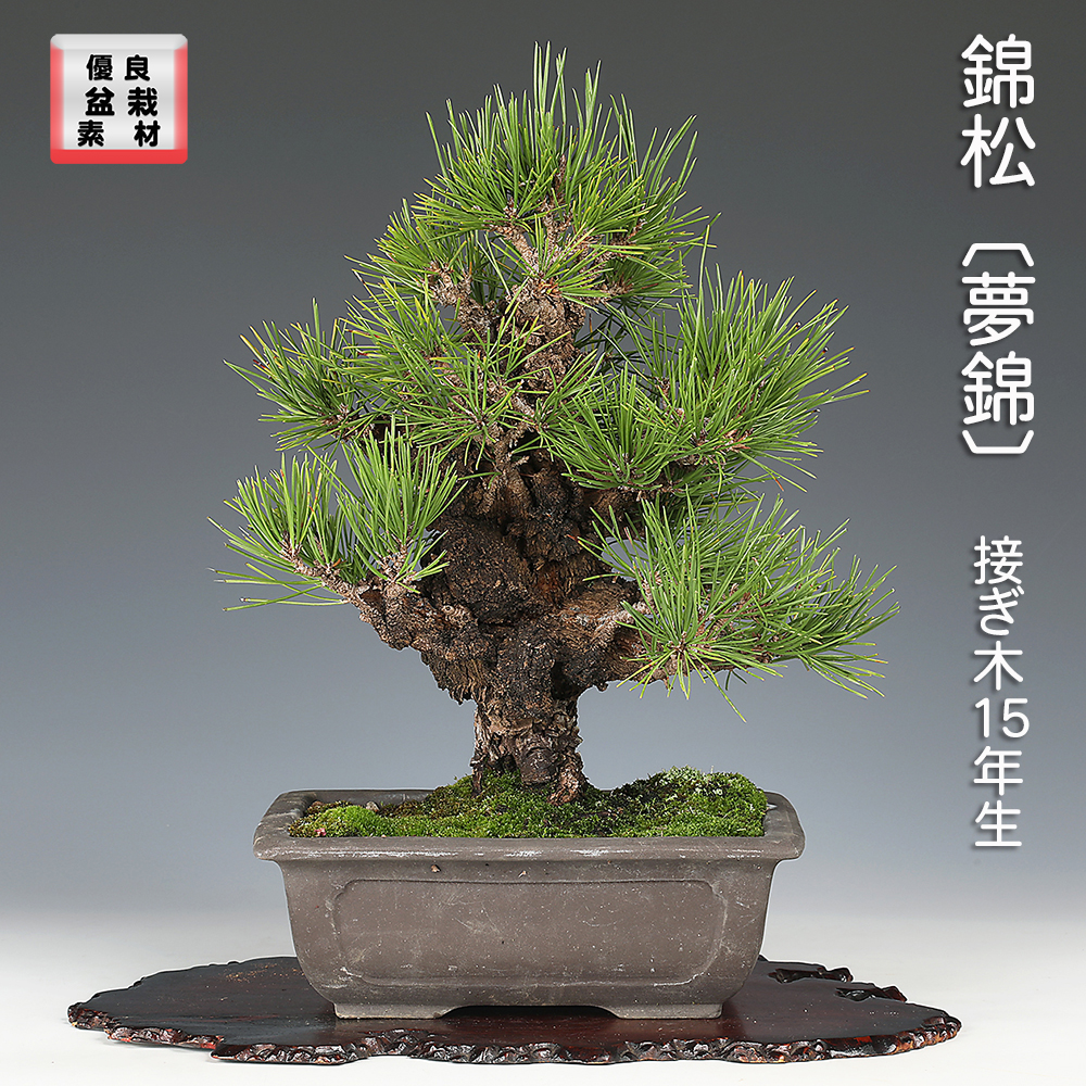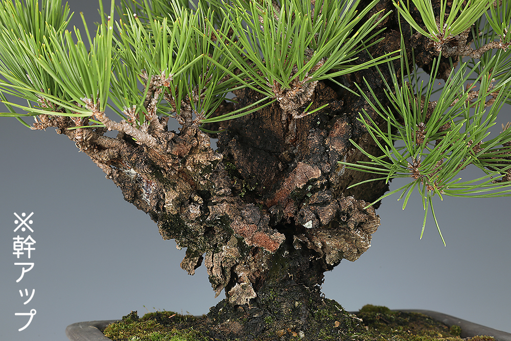 錦松の中でも特に皮性・葉性の優れた選抜品種「夢錦」の優良素材です。豪快に割れる幹肌、濃緑色の葉も魅力で、飾り映えする力感に満ちた樹姿です。ほぼ完成の域にあり、飾って楽しむことができます。