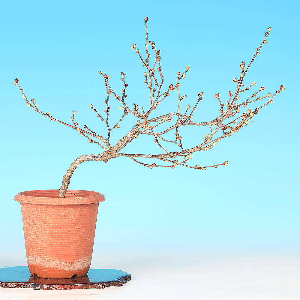 早春に開花する花物盆栽は黄色い花を咲かせるものが多いのですが、その中でも土佐水木は鮮黄色の花をシャンデリアのごとく下垂させて咲かせ、一際輝きを見せる存在です。自生環境では株立ちになる性質も、盆栽では本格模様木や懸崖など幅広い樹形展開が楽しめ、花の美しさと作りやすさで、非常に人気の高い樹種です。