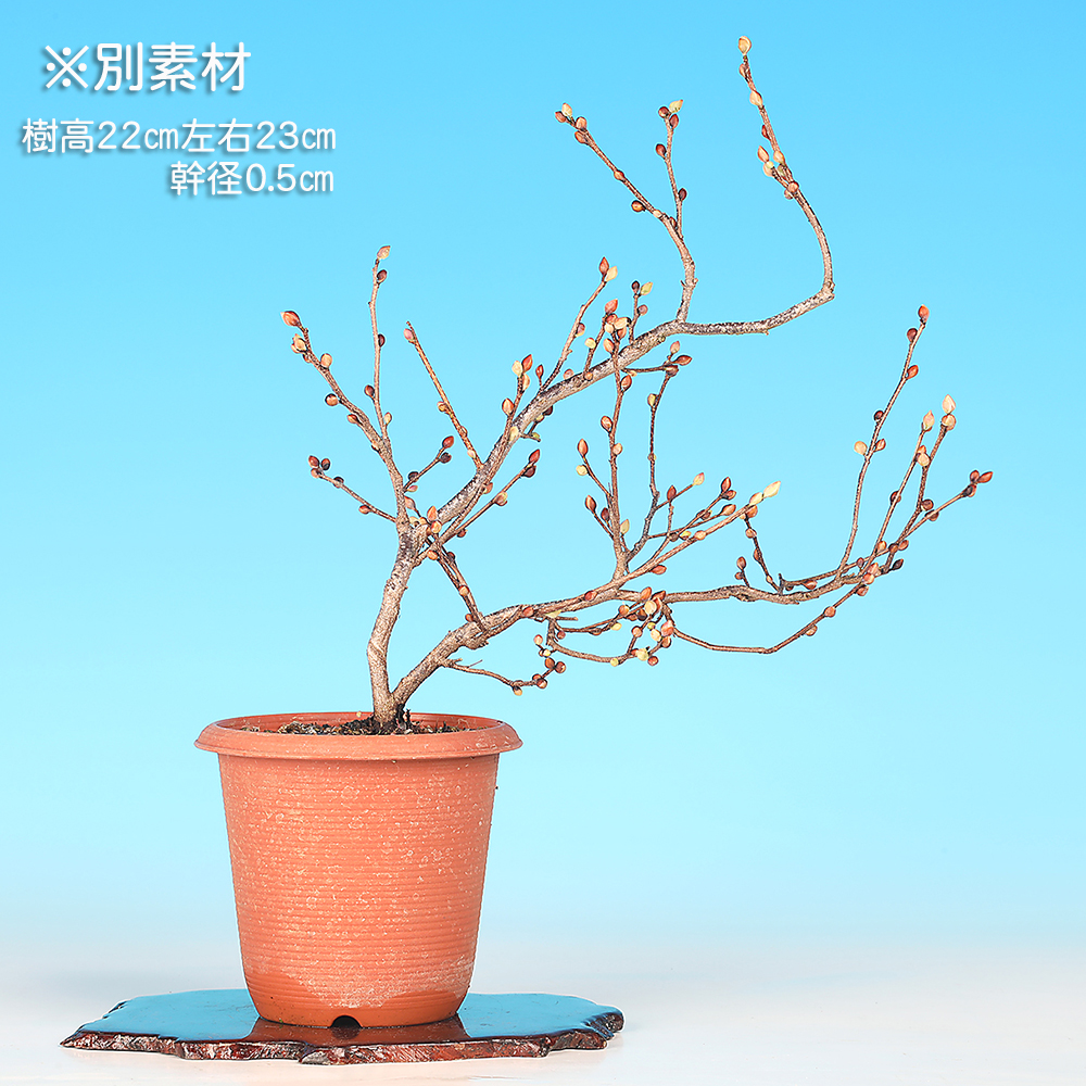 早春にシャンデリアのように垂れ下がる黄色いの花が魅力。土佐水木の仲間ですが花も葉も土佐水木より少し小さいので、より小品・ミニ盆栽向きといえます。素材の樹形にはバラツキがありますが、いずれも幹は自然な流れを見せ、枝も柔らかくほぐれています。プラ鉢入。