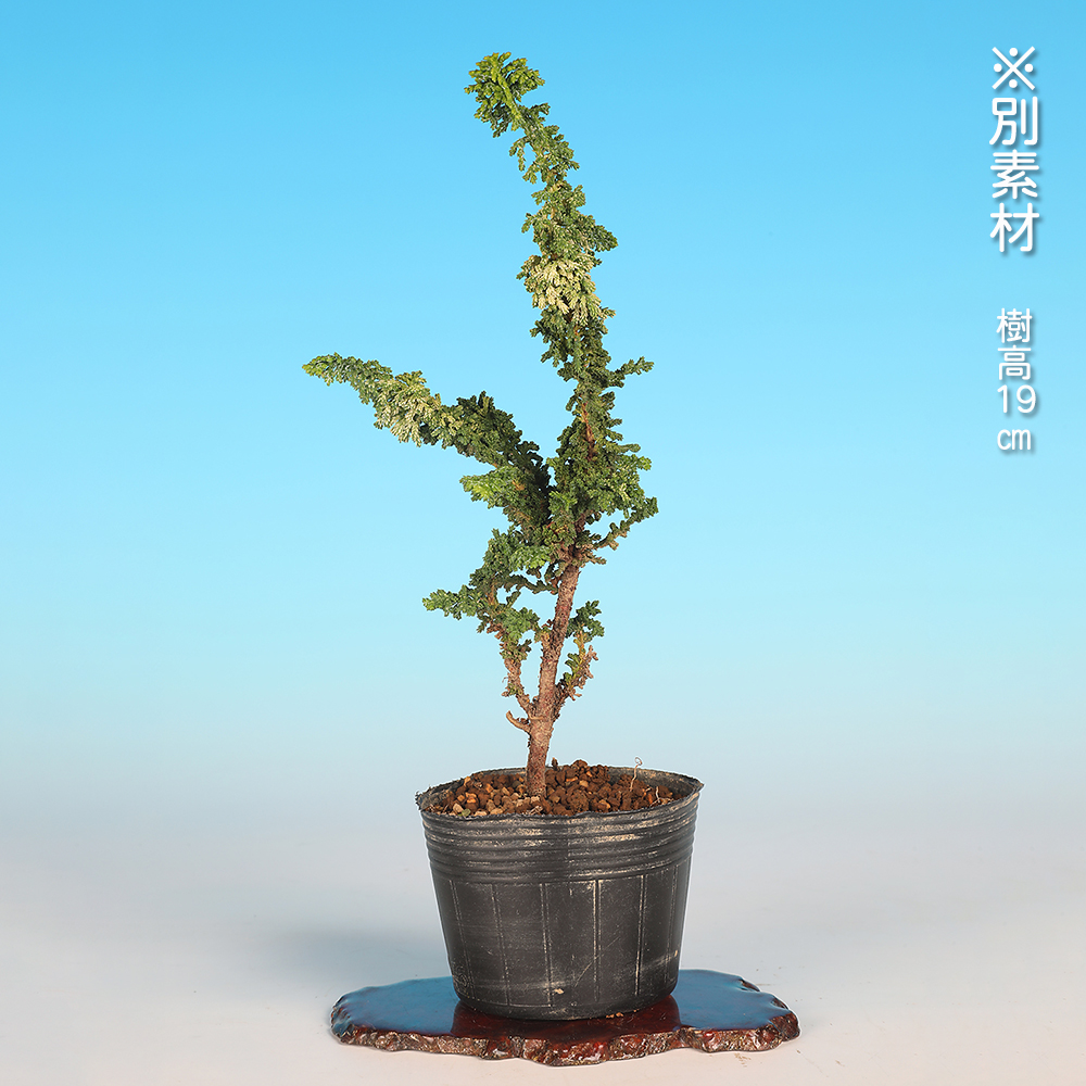 日本固有の常緑高木で、建築用材として広く利用される馴染みの深い桧。その桧の八ツ房品種で葉も細かくなる小品盆栽に適した石化桧の素材。その銀芽祖竿で、生長点が白く変色して美しい品種です。葉が細かくミニ盆栽に仕立てるのに最適な品種です。