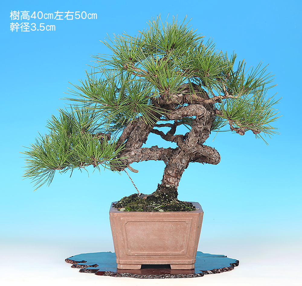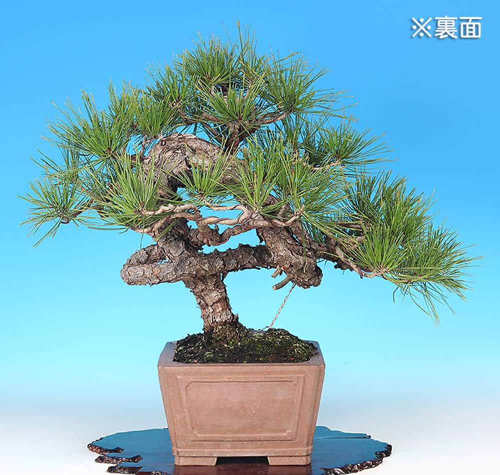 大きくループする幹模様が個性的な赤松。これだけの動きを見せる樹ながらコンパクトに収められている所も魅力です。幹に見る古色感も素晴らしく、赤松らしい自然味に富んだ一樹です。現状は幹模様に添わせて枝を置いて模様木樹形にまとめられていいますが、動きのある文人風に仕立てるのも面白い。樹形構想次第ではさらなる樹格向上も期待できる逸品です。
