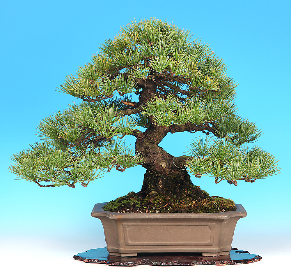 誰もが知っている「松」の代表格。丈夫な性質と優美でおだやかな姿ながら、盆栽樹種の中でも一、二を争う人気樹種です。五葉松の魅力はなんと言ってもその美しい常緑の葉にあります。短小で密に生じる葉はあらゆる樹形に調和し、様々な風趣を醸し出します。存在感たっぷりの重厚な雰囲気、枯淡の味に満ちた老木の風情など、樹形展開の幅広さが大きな魅力です。