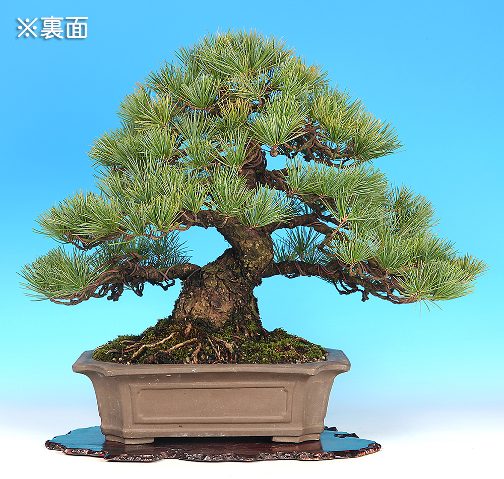 大きく広がった根張りからコケ順良く伸び上がる幹模様が美しい。また、模様を強調するように配置された役枝のバランスも素晴らしい一樹。サイズも中品盆栽に最適な寸法です。本性の五葉松として葉性も美しく、プロの整姿済みで中品五葉松の模様木として完璧な樹姿を見せる逸品。即展示可能な状態です。
