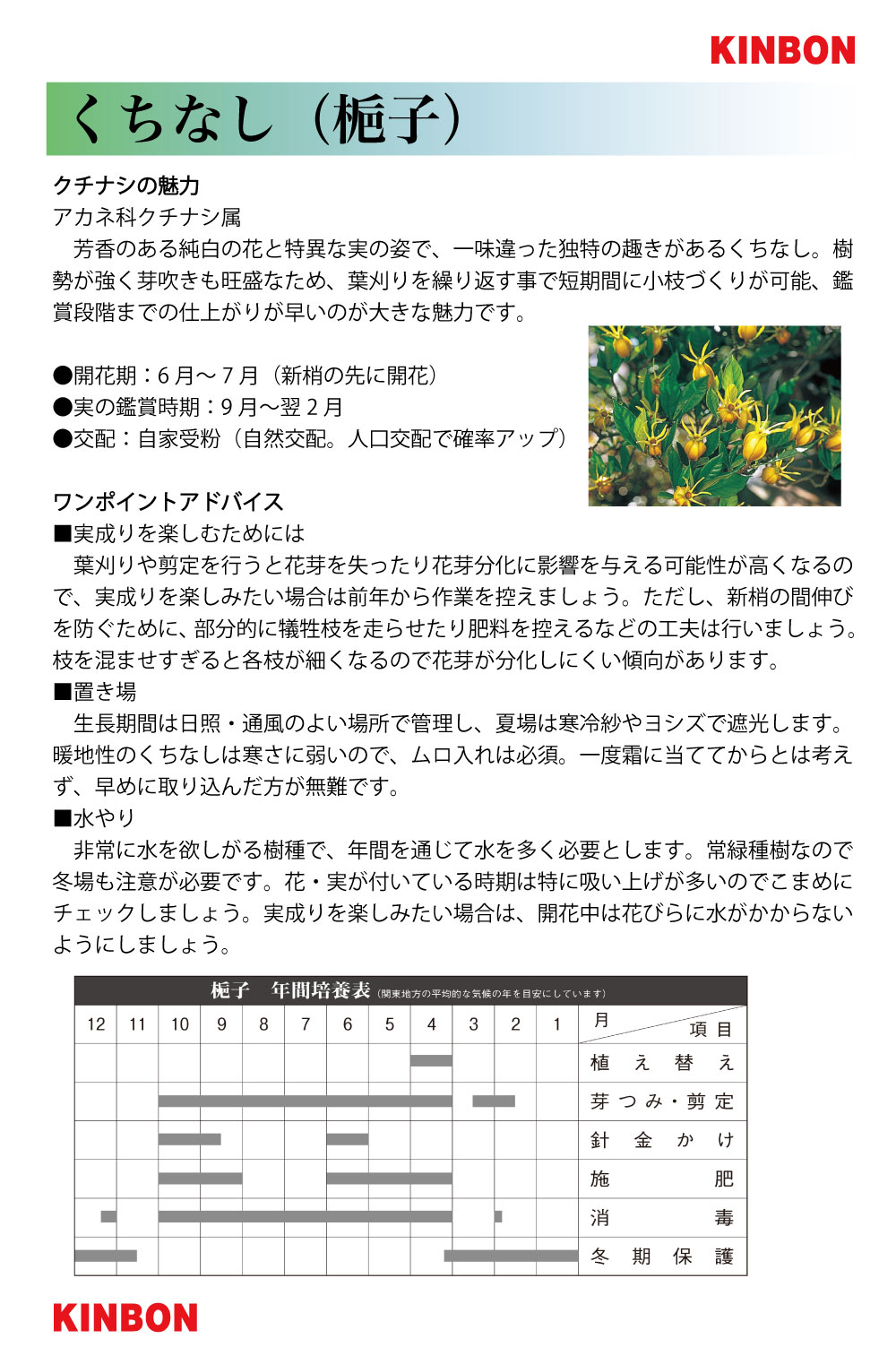 芳香のある純白の花と特異な実の姿で、一味違った独特の趣きがあるくちなし。樹勢が強く芽吹きも旺盛なため、葉刈りを繰り返す事で短期間に小枝づくりが可能、鑑賞段階までの仕上がりが早いのが大きな魅力です。