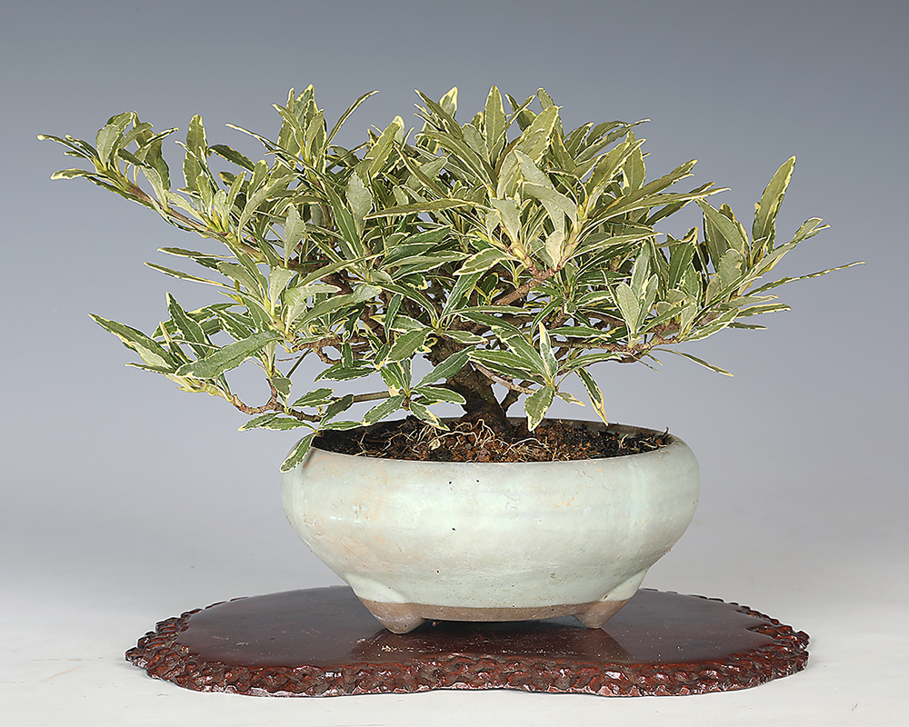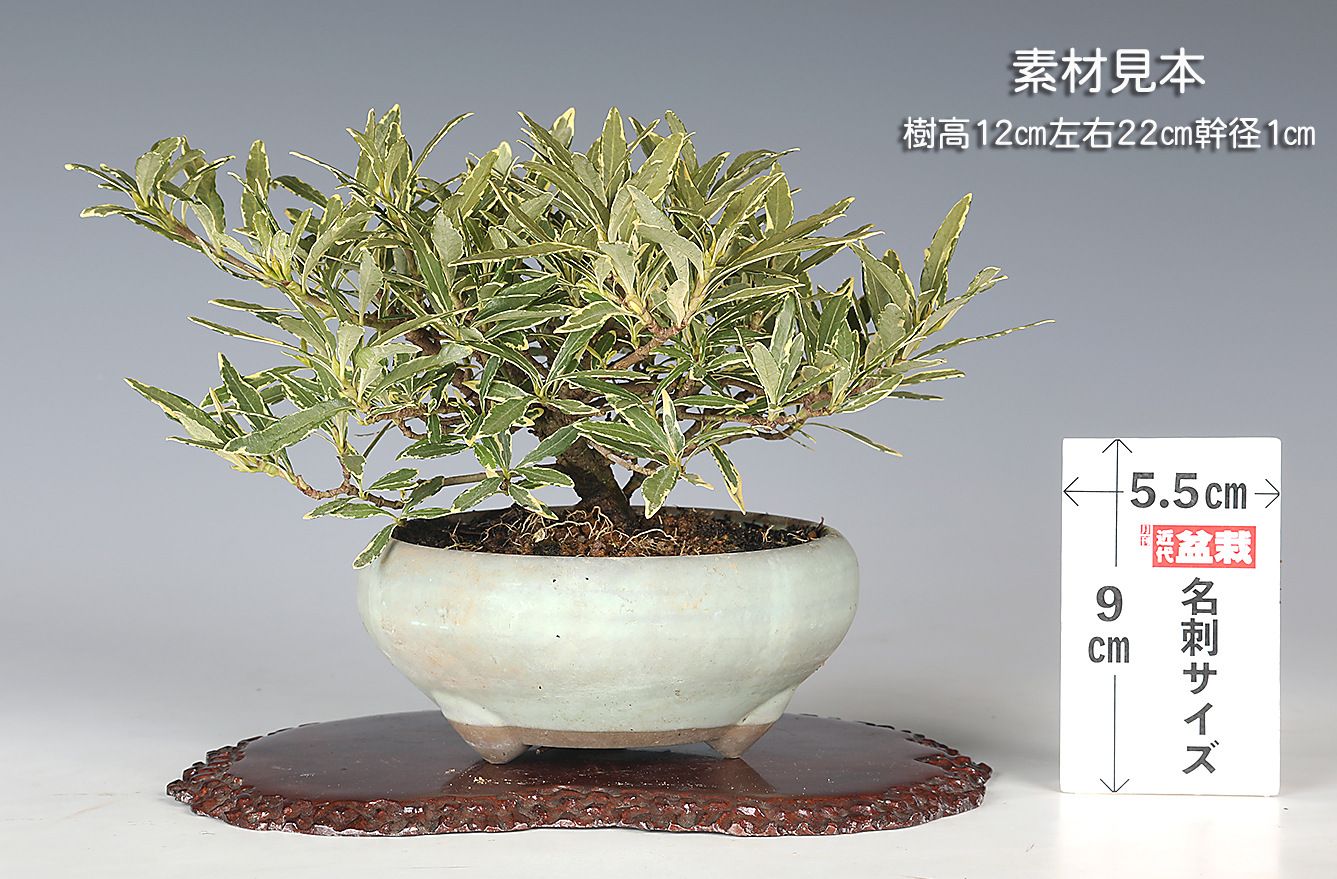 芳香のある純白の花と特異な実の姿で人気のくちなし。常緑種で冬場に実を楽しめることでも盆栽樹種として人気が高いです。そのくちなしの斑入品種。春の花姿、秋〜冬の実姿に加え葉芸が楽しめる一年中見応えのある素材です。