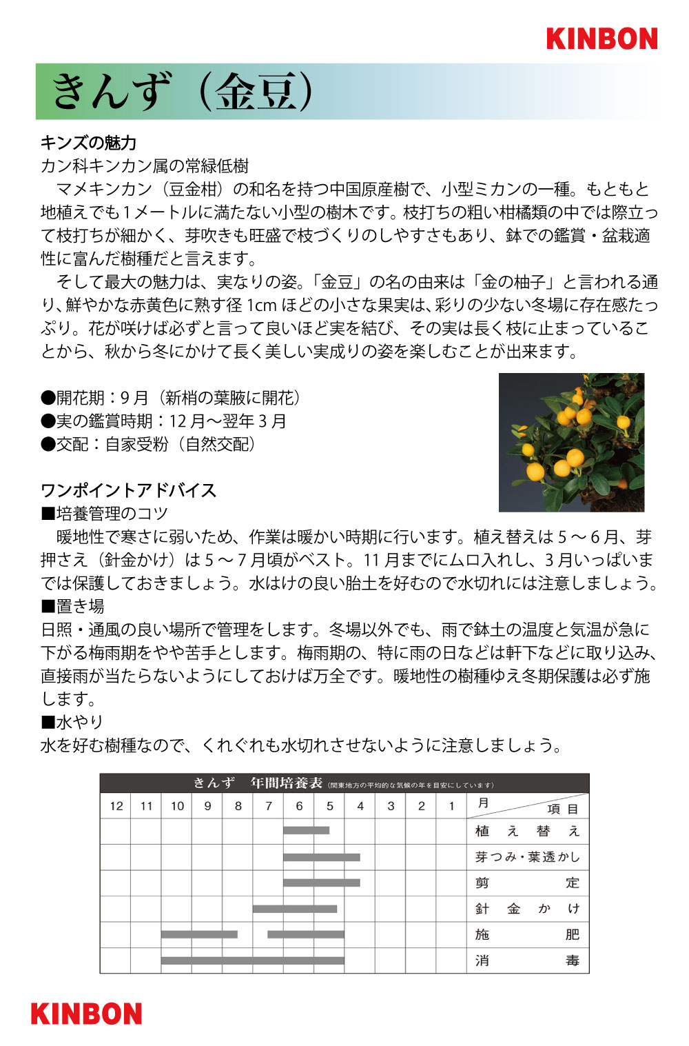 小型ミカンの一種で、地植えでも1mに満たない小型の樹木「きんず」。枝打ちの粗い柑橘類の中では際立って枝打ちが細かく、芽吹きも旺盛で枝づくりのしやすさもあり、盆栽樹種とした極めて高い人気を誇ります。そして何よりの魅力は実姿です。赤黄色に熟す径1cmほどの小さな果実は、彩りの少ない冬場に存在感たっぷり。花が咲けば、ほぼ実が成り、実も長く持つので、初心者も十分に楽しめる樹種です。