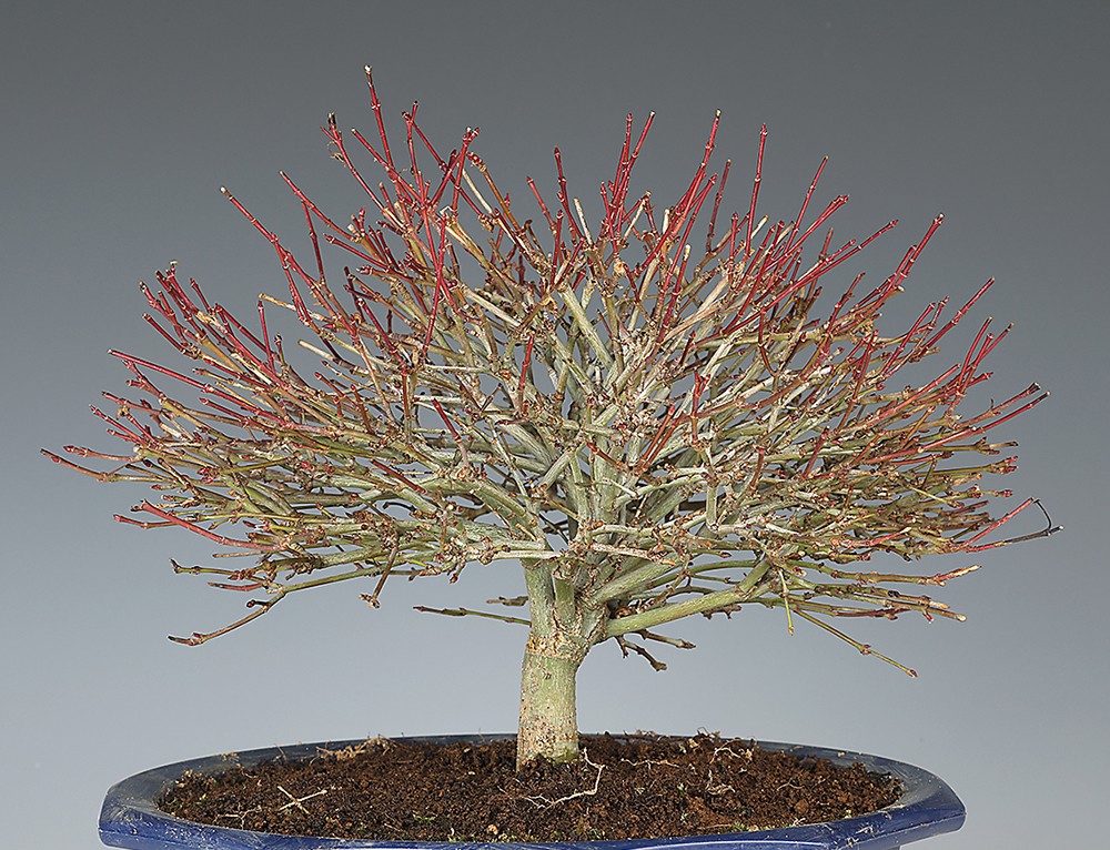 4月頃に萌芽する新芽は、芽がほころんだ頃に先端を摘み取るのが基本作業。枝を太らせたい場合は摘み取らずに犠牲枝として伸ばしておきます。若木であれば5~6月頃に葉刈りを行うこともできますが、葉刈りをすると不定芽を多く生じて芽処理に手間がかかります。枝が混んでくれば葉刈りをやめて日照や培養条件を改善する目的で葉を半分に切る「葉切り」や対生で出る葉の片方だけを切る「葉透かし」などを行いましょう。整姿の適期は6月頃。剪定は落葉直後もしくは芽動き直前の3月頃が最適です。