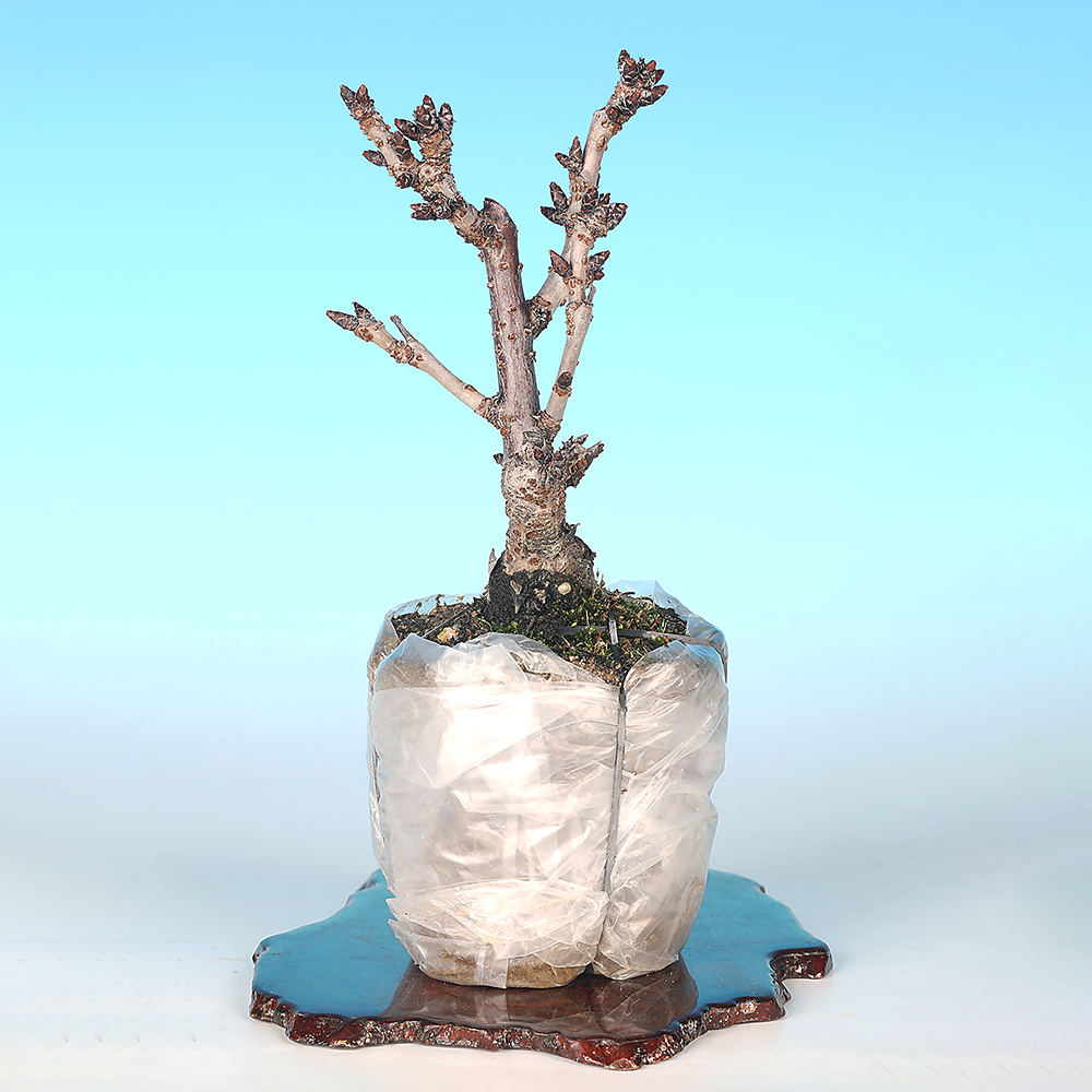 日本の春を代表する花木・桜。盆栽としても春の展示会には欠かせない存在です。自然交雑や交配から重弁の桜の園芸品種の総称として里桜と呼びますが、旭山桜はその里桜の一種。露地植えでも2mと小型で盆栽や鉢植えとして普及しています。八重咲の一才性で、花付きが良いので大変人気の品種です。