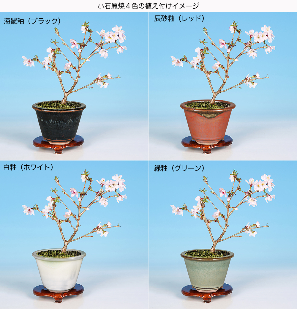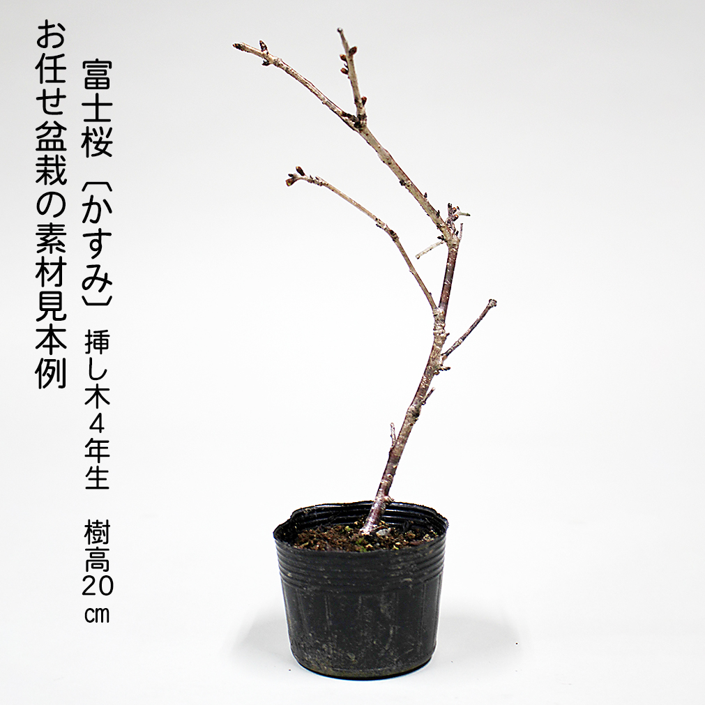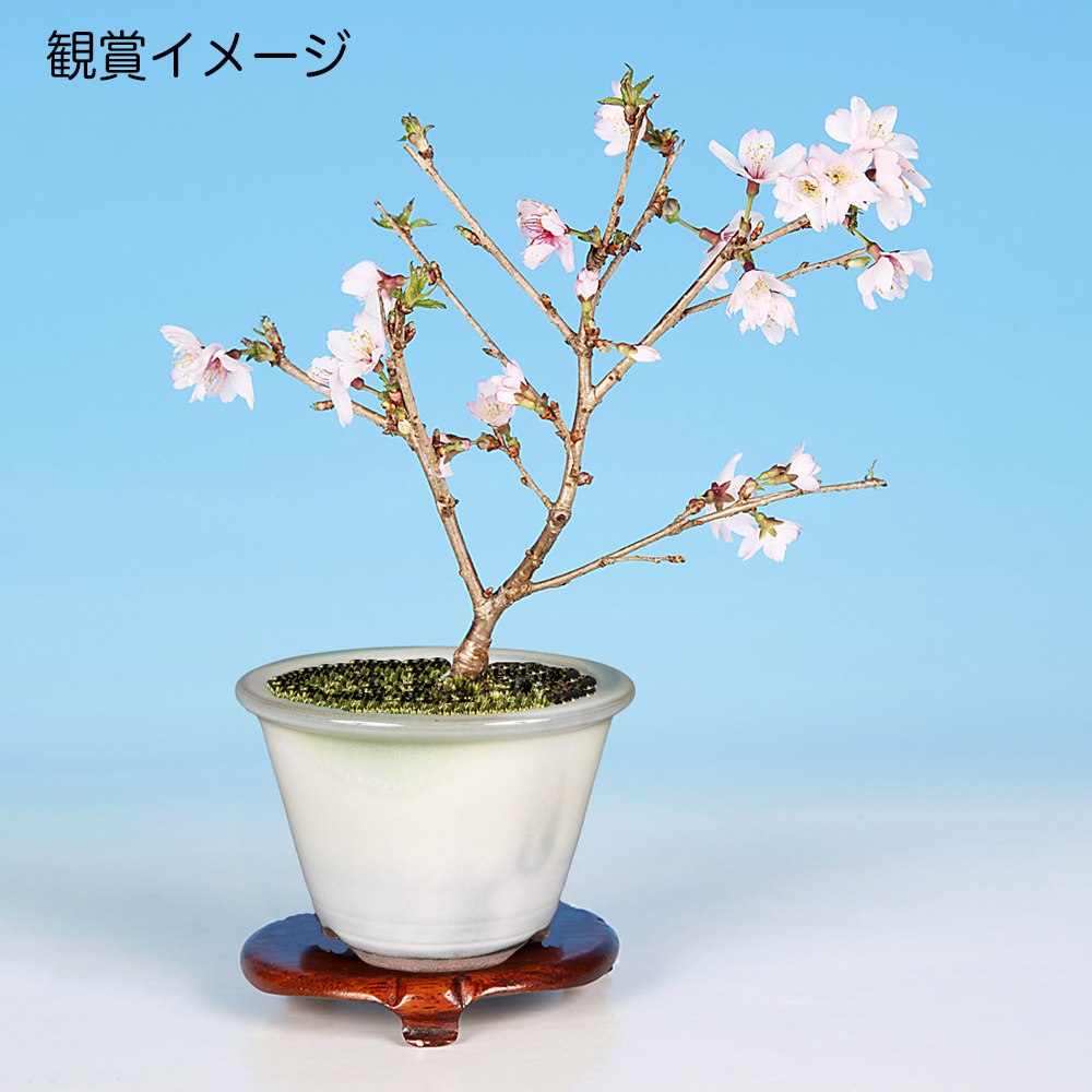 ◆写真の素材はサンプルです。写真の素材は平均的なものを撮影しておりますが、多少のサイズ・樹形・鉢の形態・絵柄等の違いは御容赦頂き、素材の選別は小社に御一任下さい。◆季節や樹種によっては、お届け時には花・実・葉等が落ちているのもありますことをご了承下さい。なお、実・花の部分アップはあくまで参考例です。また、卓や地板は撮影用のものです。サクラの魅力バラ科サクラ属 古来より日本の春を代表する花木として、誰もが愛着を持つ樹種です。盆栽としても春の展示会には欠かせない存在です。一口に桜といっても秋咲きの「十月桜」、冬に咲く「河津桜」、寒中から春先に咲く「寒桜」「緋寒桜」、春先の「彼岸桜」「山桜」「富士桜」「江戸彼岸」、そして「染井吉野」「枝垂桜」「大島桜」、晩春を彩る数々の「八重桜」や園芸品種たち。まさに桜の品種は多士済々です。ワンポイントアドバイス■培養管理のコツ 花芽は充実した短枝の先端に分化し翌年の春に開花。剪定の適期は休眠期で、その時点で葉芽・花芽は確定しているので、剪定に際しては花芽を落とさないようにします。徒長枝には花芽が着きにくいので徒長枝のみ2~3節に切り戻し、花後に改めて葉芽を確認して剪定しましょう 剪定痕から菌が入ることがあるので、剪定前にハサミの消毒と切り口にも癒合剤を塗布しておきましょう。■置き場 日照・通風のよい置き場が適しますが、夏場は寒冷紗などで遮光します。寒さには強いので、冬場は軒下程度の保護で十分です。■水やり 非常に水を好む樹種で、葉が大きく水分が蒸散しやすいので生長期や開花期はとくに水切れに注意しましょう。※当店では実店舗での販売も行っているため、在庫の反映がリアルタイムではなく売り切れている場合があります。その場合は、申し訳ございませんがキャンセルさせていただくことをご了承下さい。