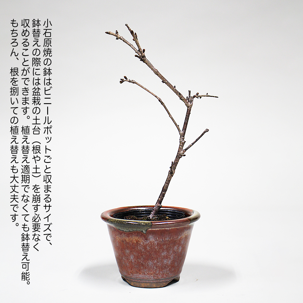 商品説明 季節の盆栽とそれに合う盆栽鉢、そして鉢替え(植え替えも可能)に必要な用土と道具(ネットと針金)を一つのパッケージにしました。 盆栽をこれから始めてみたい。盆栽を作ってみたい。盆栽を少しいじってみたい。そんなあなたにぴったりのキットです。もちろん、盆栽素材と鉢のセットが欲しい方にもお得なセット内容となっています。【盆栽について】 7.5cmビニールポット入りの雑木のミニ盆栽。季節に応じて花や実、あるいは葉姿などが楽しめる素材をご用意します。素材の選別は弊社にご一任下さい。 今回の季節の盆栽は富士桜(※品種はお任せになります)写真の素材見本:富士桜〔かすみ〕挿し木4年生 樹高20cm【盆栽鉢について】 小石原焼3号深外縁丸鉢(口径10.5cm高7cm)をご用意。この鉢は7.5cmビニールポットがそのまま入るサイズで、盆栽をビニールポットから外して、そのまま鉢にセットして少し用土を足すだけで鉢替えが可能となっています。植え替えの時期ではない。まだ本格的な植え替えに自信がない。そんな場合でも鉢替えができます。また鉢の釉薬(色)が4タイプあり、お好みで選んで頂けます。【用土について】 プロが配合、そのまま使える完全混合培養土・クレイキング・雑木山野草用(小粒)をご用意。1回の植え替えに必要な200gを同封します。【その他】・ネット(鉢穴から用土がこぼれないよう塞ぐもの)・針金(鉢とネットを固定する針金1本、盆栽を固定する針金2本)※苗木素材の為、樹形やサイズにバラツキはあります。※花芽保証素材ではありません。ご了承下さい。