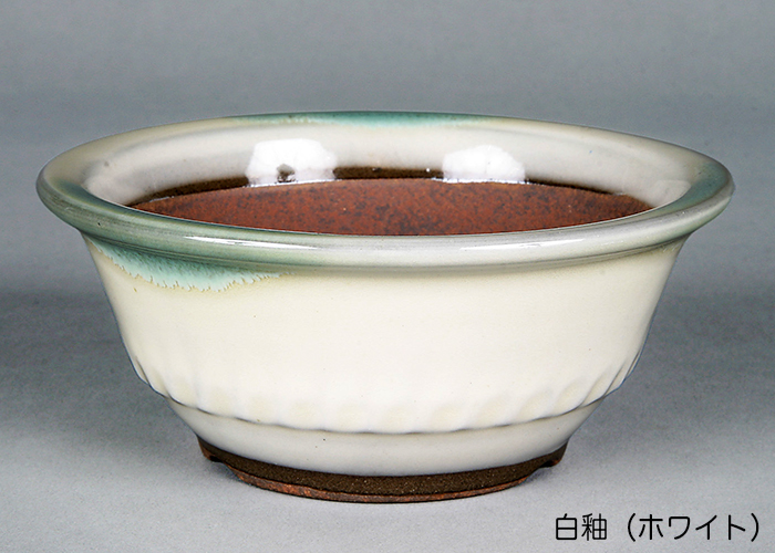胴縄の意匠を施したデザイン性に富んだ丸鉢。椀型の優しい型は小品盆栽から山野草まで幅広く使えます。白釉・辰砂釉・海鼠釉・緑釉、各1点ずつの4点セットです。