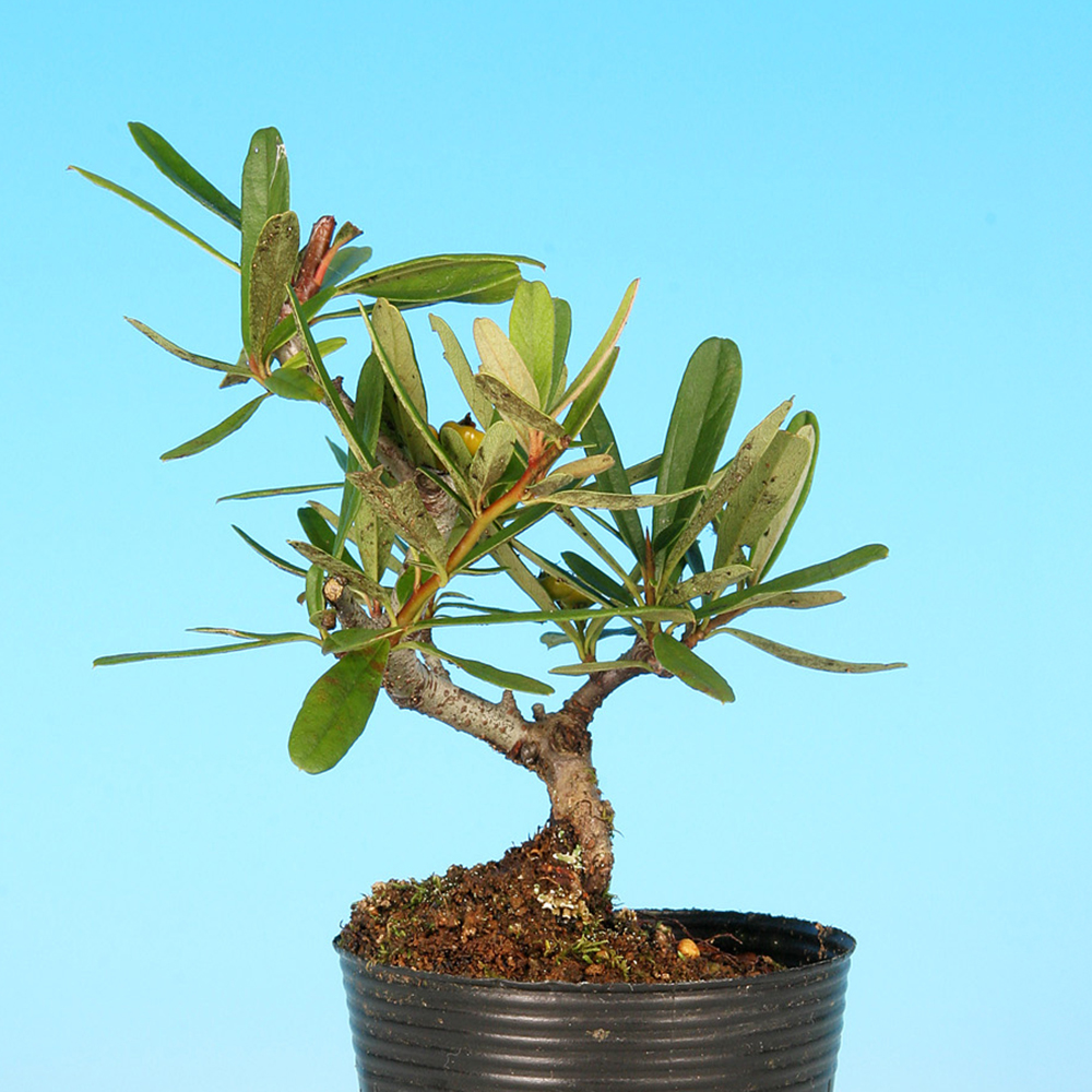橘もどきの基本種。幹肌の荒れと黄橙色の小実が魅力で高い人気を誇る樹種です。実付きは他の品種と比べるとやや劣りますが、樹性強健なので樹形の幅も広く、樹の個性を活かした樹づくりが楽しめます。これから盆栽を始めようとする方にもオススメです。