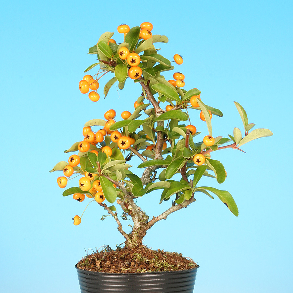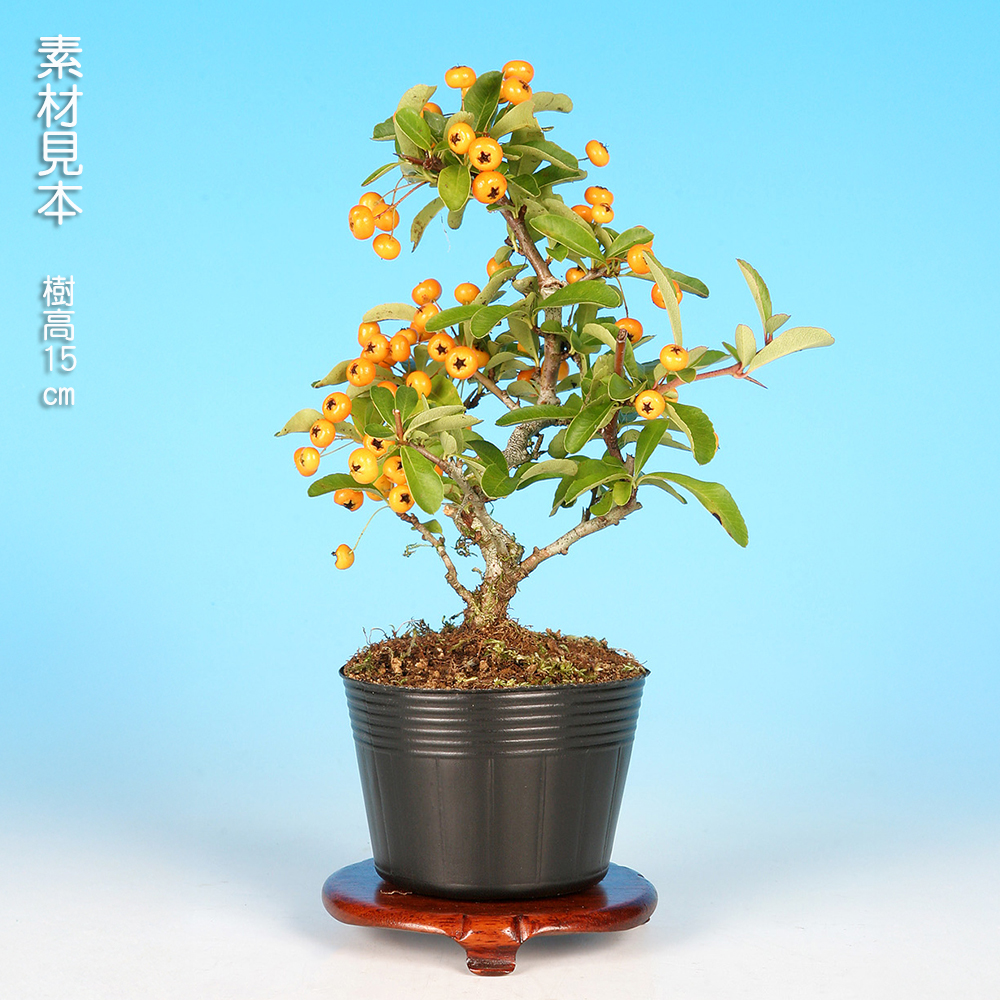 幹肌の荒れと黄橙色の小実が魅力で高い人気を誇る樹種です。別名「ヒマラヤトキワサンザシ」。葉が普通種より細く、実も小さいのが特徴。樹性も強健なのでこれから盆栽を始めようとする方にもオススメです。