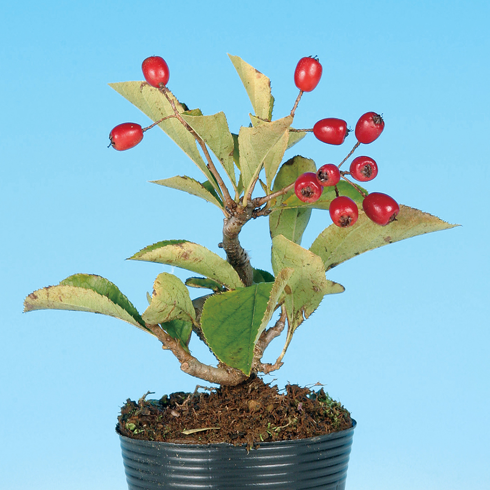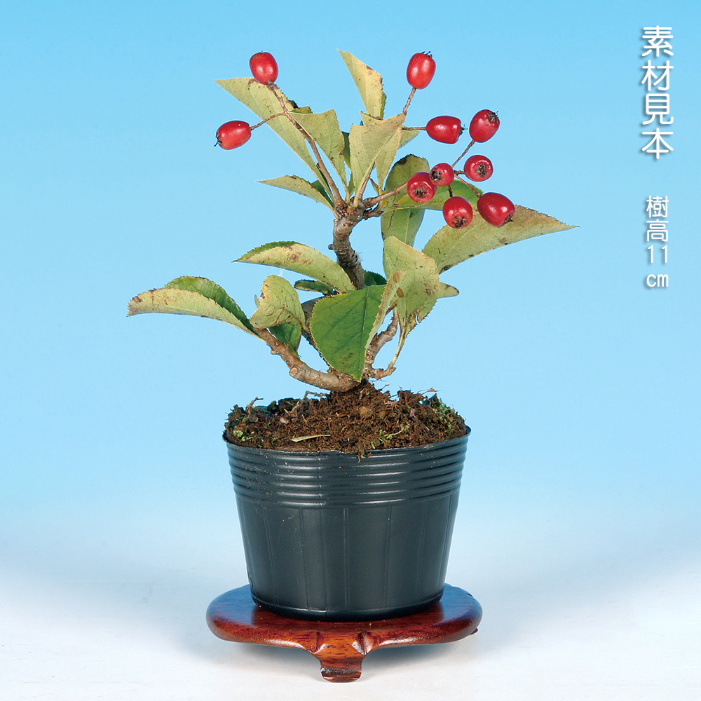 カマツカの名は、枝が強靱で折れにくく、鎌柄など用いられた事に由来します。4~5月頃、新梢の先端に散房花序を出して白花を多数開き、秋には光沢のある紅色の果実が熟します。盆栽としては日本の自生種のほか、西洋カマツカも多く作られています。