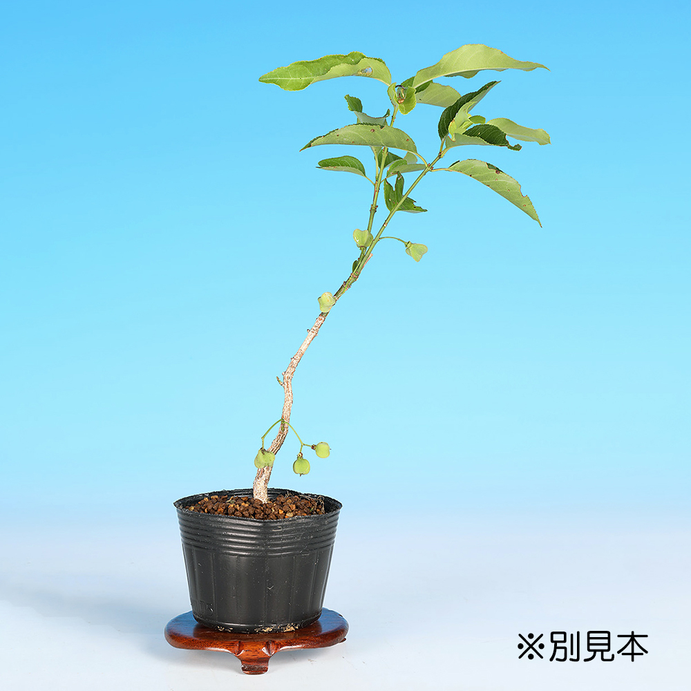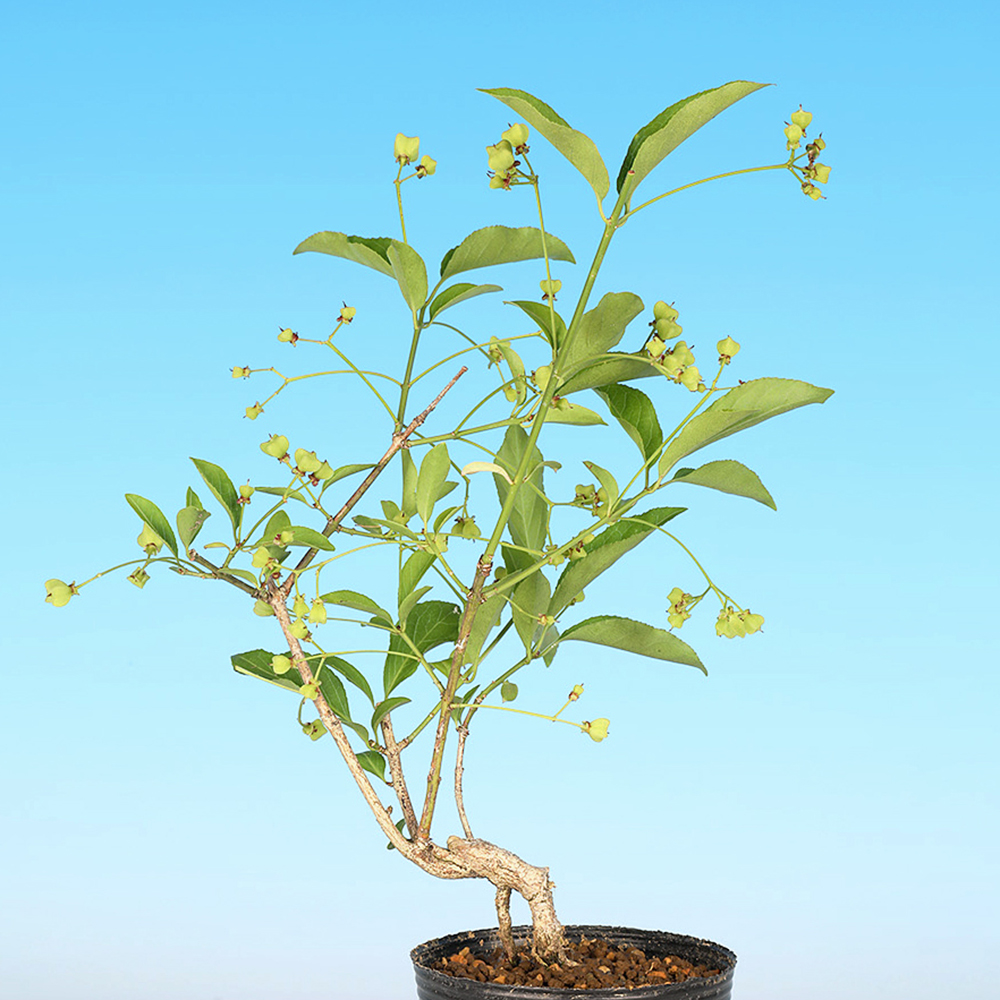 普通種のまゆみに比べて実色が赤く、紅葉が美しい品種。実物盆栽として「まゆみ」は比較的ポピュラーな樹種です。実姿を楽しむには雄木との交配で実成りの確立が高くなります。