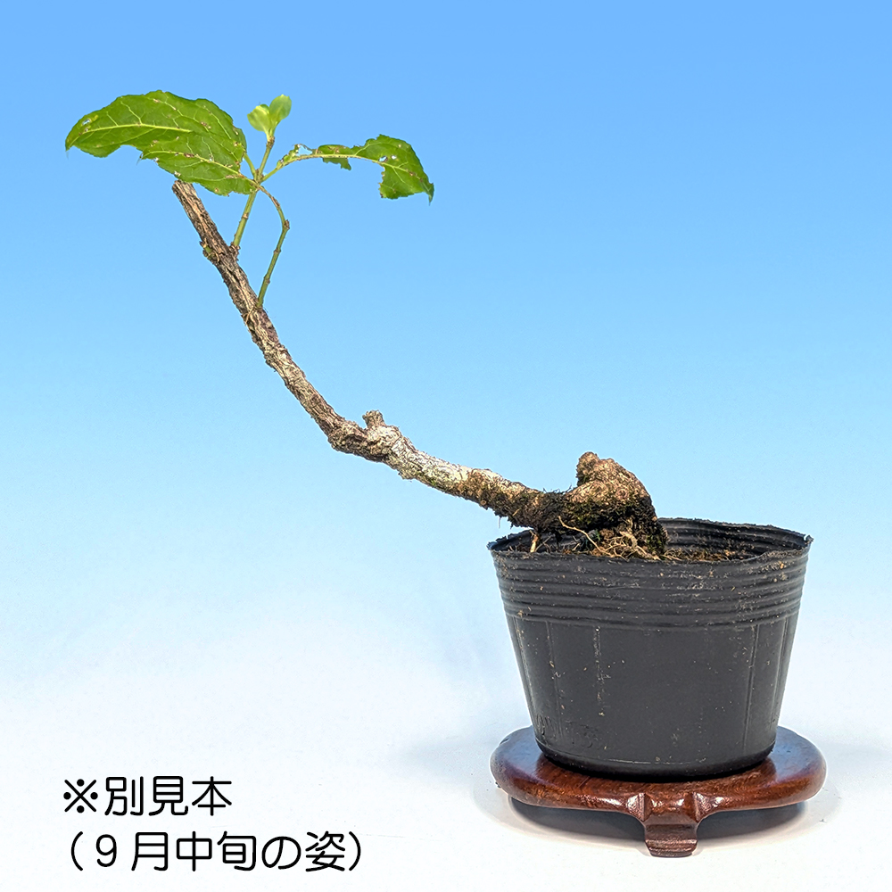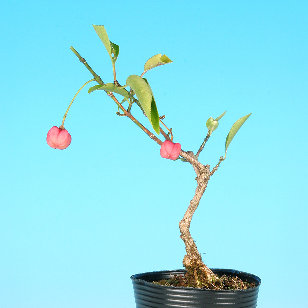 盆栽樹種としては比較的ポピュラーな存在のまゆみの苗木素材。普通種より深く肌が荒れ、比較的早い段階で幹肌に古色が表れる品種です。自然交配でも実は生りますが、雄木との交配で実生りの確立は高くなります。