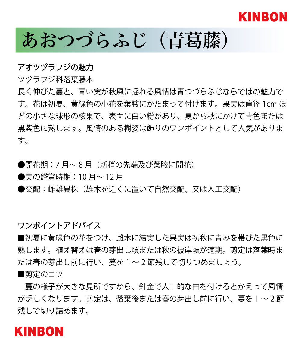 長く伸びた蔓と、青い実が秋風に揺れる風情は青つづらふじならではの魅力です。花は初夏、黄緑色の小花を葉腋にかたまって付けます。果実は直径1cmほどの小さな球形の核果で、表面に白い粉があり、夏から秋にかけて青色または黒紫色に熟します。風情のある樹姿は飾りのワンポイントとして人気があります。