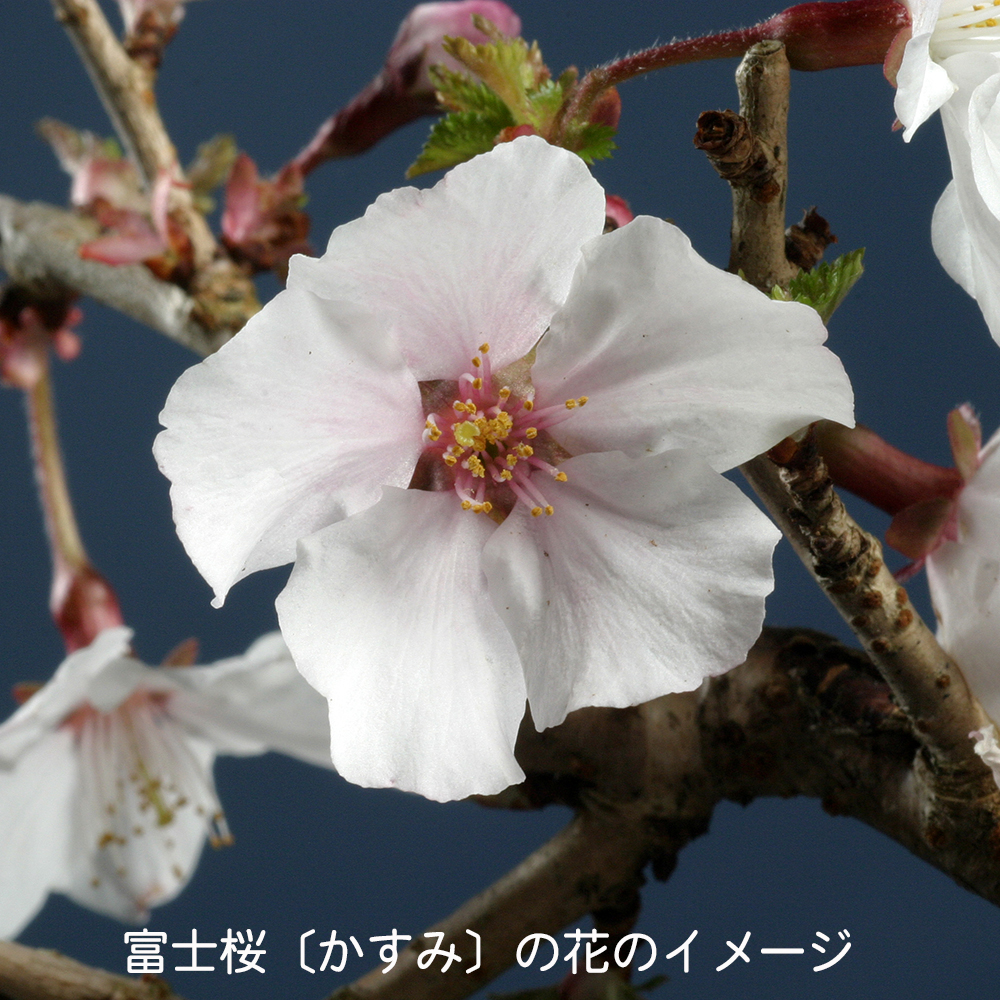 富士桜の一品種で一重の大輪で白から薄桃色の花を咲かせる人気品種〔かすみ〕。大きく育てるのもよし。ミニ盆栽に仕立てるのよしの苗木素材。卓上で手軽にお花見を楽しんで下さい。お部屋のインテリアやガーデニングなどにもオススメ。