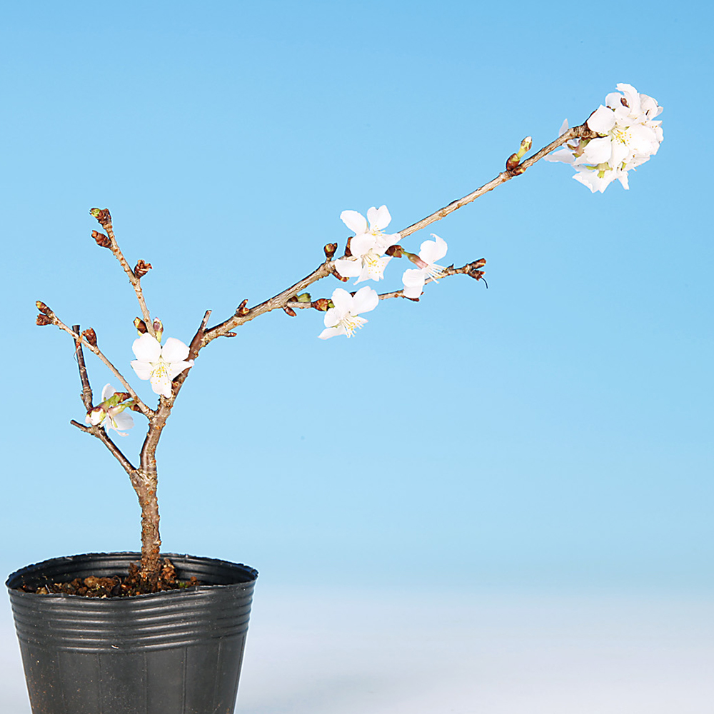 日本の春を代表する花木・桜。盆栽としても春の展示会には欠かせない存在です。「信濃寒桜」はオオシマザクラとヒカンザクラの自然交配種といわれ、白から淡い桃色の一重の小さな花を可憐に咲かせる人気品種です。また、二季咲き性で10月頃から2~3月頃までポツポツと花を咲かせ、長く楽しめる希少品種です。大きく育てるのもよし。ミニ盆栽に仕立てるのよしの苗木素材。卓上で手軽にお花見を楽しんで下さい。お部屋のインテリアやガーデニングなどにもオススメ。