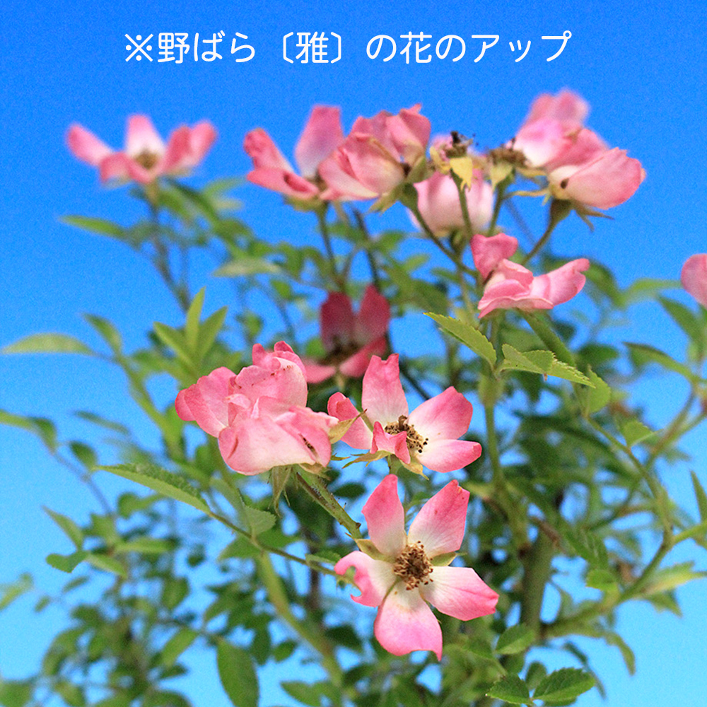 園芸界で高い人気を保ち続ける樹種「野ばら」。淡桃色で底白の小さく可憐な花を咲かせる人気品種「雅」の苗木素材。小枝も細かく分岐するので、枝づくりは比較的容易です。