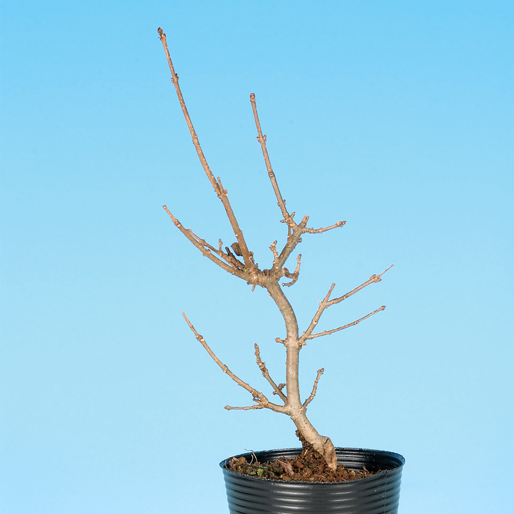晩秋から冬にかけて、深紅に輝く小粒の果実で周囲を明るくしてくれる梅もどき。枝づくりがしやすく、幹肌や枝ぶりにも味がり、つくっても飾っても楽しい樹種です。数ある実物盆栽でも一・二を争う人気樹種です。