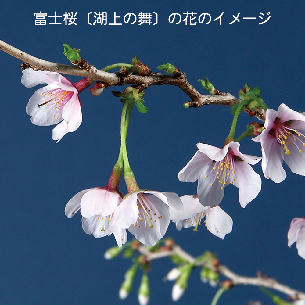 富士桜の一品種で枝に自然とジグザグと模様が入る雲龍性の品種「湖上の舞」。木が若いうちは目立ちませんが、歳を重ねるごとに枝がうねるようにくねくねと展開して味わい深い樹形になっていきます。花色は白~淡ピンク色、直径2~3cmの一重咲き。花付きが良く、小さくまとまるので小品盆栽・ミニ盆栽向きです。卓上で手軽にお花見を楽しんで下さい。お部屋のインテリアやガーデニングなどにもオススメ。
