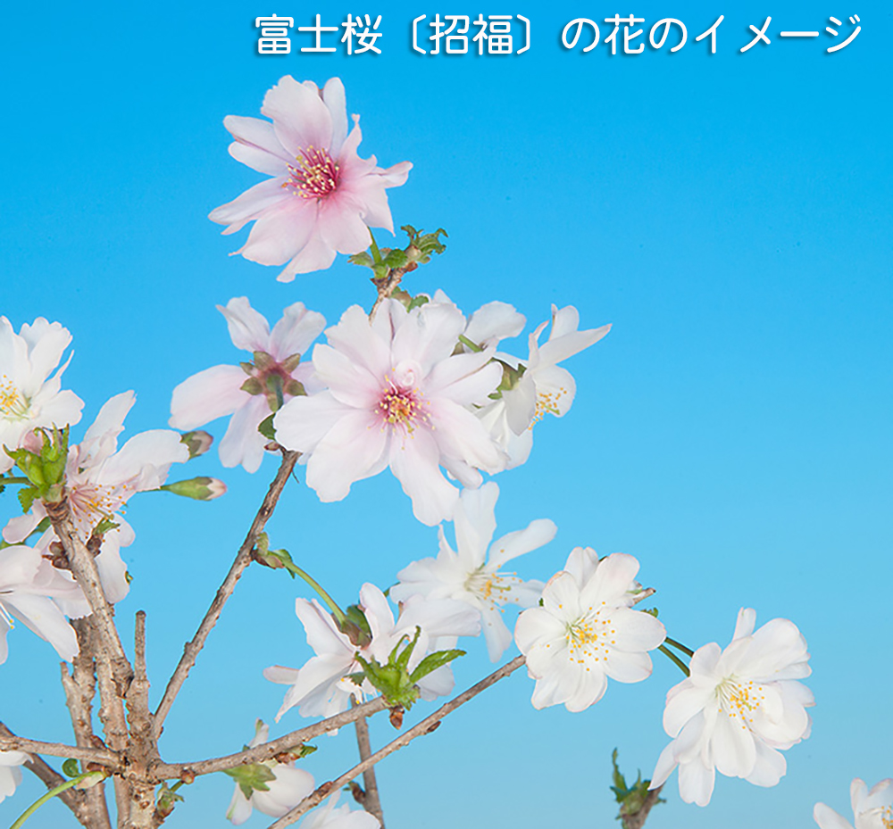富士桜の一品種で可憐な二重咲きが魅力の「招福」。大きく育てるのもよし。ミニ盆栽に仕立てるのよしの苗木素材。卓上で手軽にお花見を楽しんで下さい。
