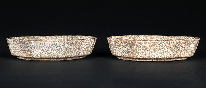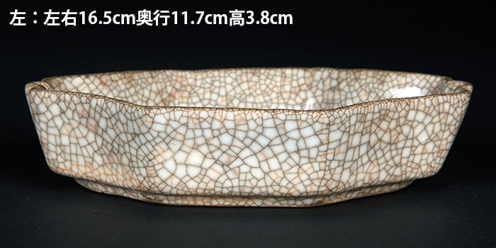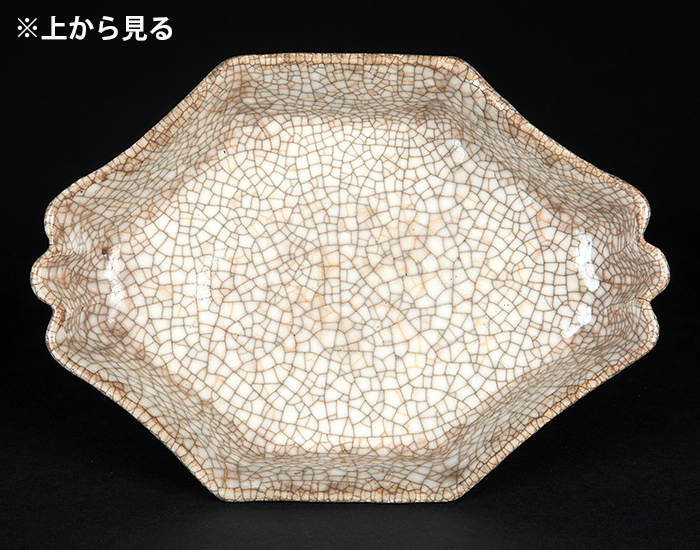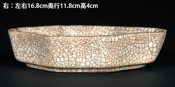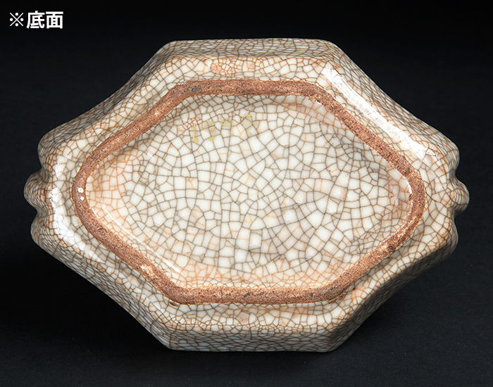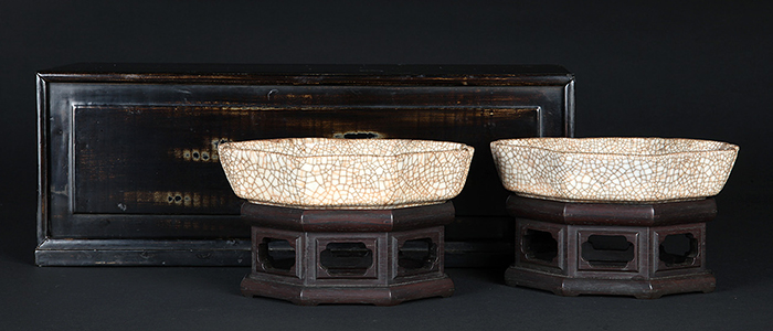 饒州(にょじゅう)窯は中国・唐代まで歴史を遡ることができる古窯。宋代には御用窯として隆盛を極め、景徳鎮窯へと伝統が受け継がれた。白磁風の作品を多く輩出し、本器のような貫入に優品が見られる。本器は平成の盆栽大家として名を馳せた髙木禮二氏旧蔵品。凝ったデザインの台座や特製の木箱とともに継承されており、中国陶芸史の資料的価値も踏まえ、盆栽界の至宝とも言うべき名品。保存状態は良好。