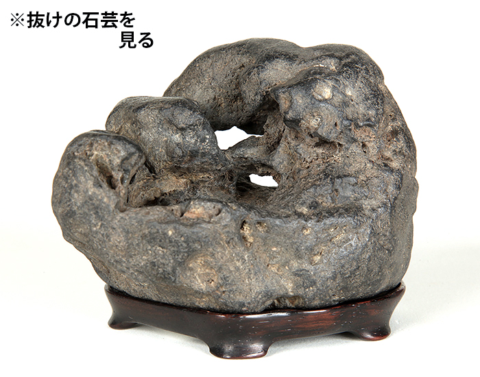持ち込みの古さを感じさせる光沢ある石質が魅力の加茂川石。中央部に見る「抜け」や「窪み」が見所です。岩潟石として秀逸な形で、海辺の景色を楽しめる一石です。