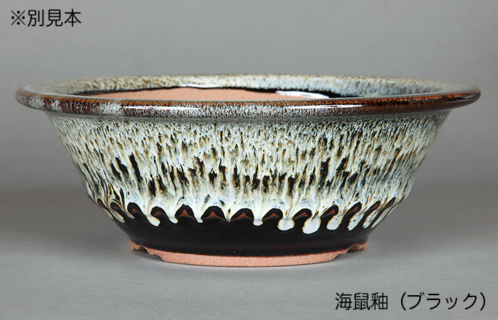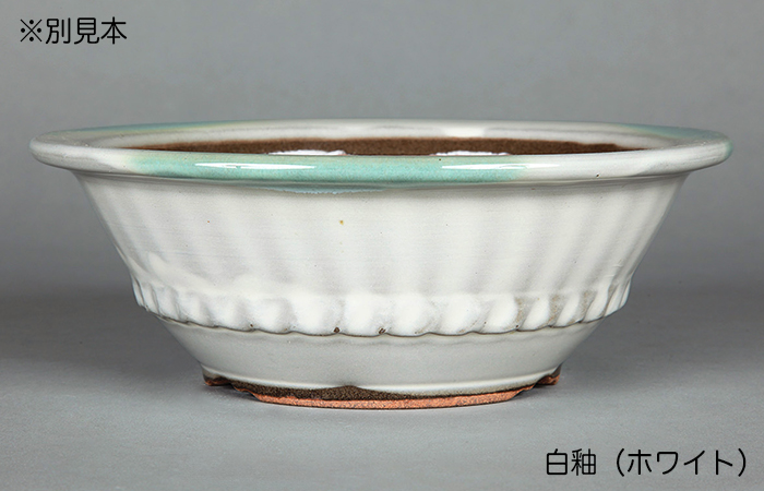 口径21cmと小石原焼としては大きいサイズ。胴縄の意匠を施したデザイン性に富んだ丸鉢です。中品・貴風盆栽、山野草なら大株や寄せ植えに使えます。白釉・海鼠釉・緑釉、各1点ずつの3点セットです。