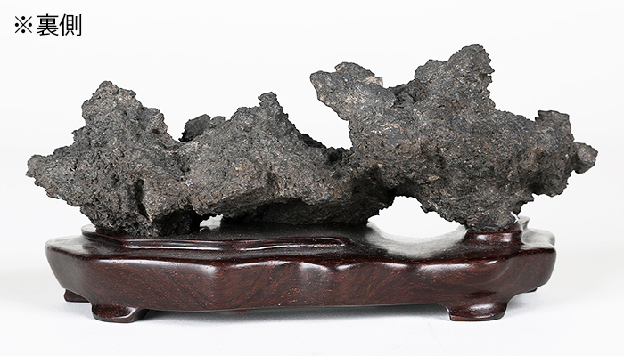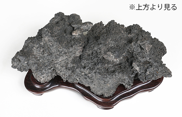 墨黒の色合いに細かなジャグレが味わい深い。激しい波打ち際の情景を彷彿させる、変化に飛んだ形状が面白い一石。見付けの巧みさや台座の丁寧な作りがこの石の世界観を存分に引き出しています。