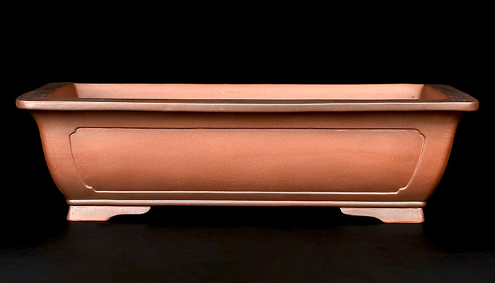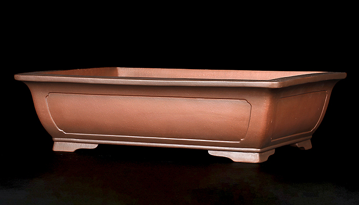 大きな入額の意匠が特徴的で側面の流麗なラインと段足が上手く調和した格調高いデザインの長方鉢。深さがある型なので培養面が安心でかなりの大きな樹も受け止めます。優しい風情の樹から迫力のある力強い樹まで幅広く対応する万能型の長方鉢です。