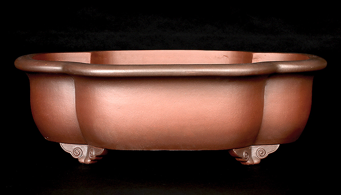 木瓜式鉢の定番と言うべき型です。この曲線美を活かした柔らかな型は中国鉢の真骨頂。深さもあるので風格も十分。どっしりとした型ですが雲足の意匠が全体を引き締め、格調高い仕上がりを実現しています。優しい樹から太幹の迫力のある樹まで幅広く対応できる一枚です。