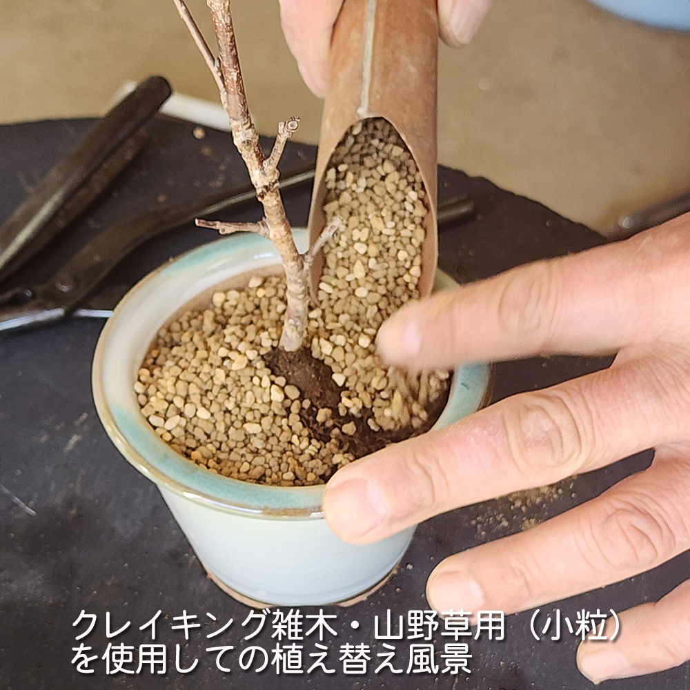 また、水捌けに大変優れており、クレイキングを使って植え替えすることで、排水性改善、根腐れ防止などの効果を期待できます。クレイキングは配合不要。便利で手間いらず。そして盆栽の育ちが良くなることに貢献する最高級盆栽用土です。