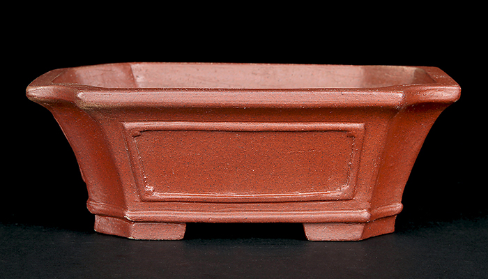 格調高い大隅切額面長方型。深さもあるので迫力のある樹を受け止めます。大振りな小品盆栽から貴風サイズまでをカバーできる作品です。