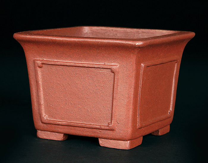 深さのある正方鉢。額面の意匠が施された格調高いデザインです。小品盆栽・ミニ盆栽の懸崖樹、半懸崖樹に最適です。