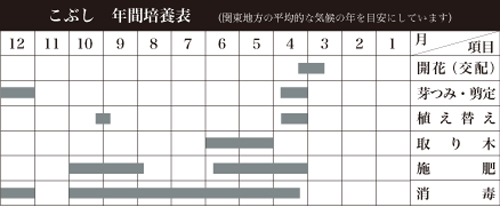 3~4月頃に開花。大きな花を前年枝の先端に咲かせます。5~6月頃に花芽が分化するので、花後すぐり徒長枝を剪定し、輪郭の間伸びを防ぎます。落葉後は短枝を残して徒長枝を軽く剪定し花期に備えます。芽吹きが良い樹種ではないので、太枝抜きなどは若木の段階で済ませ、古木になれば枝先の剪定で樹形の維持に努めましょう。