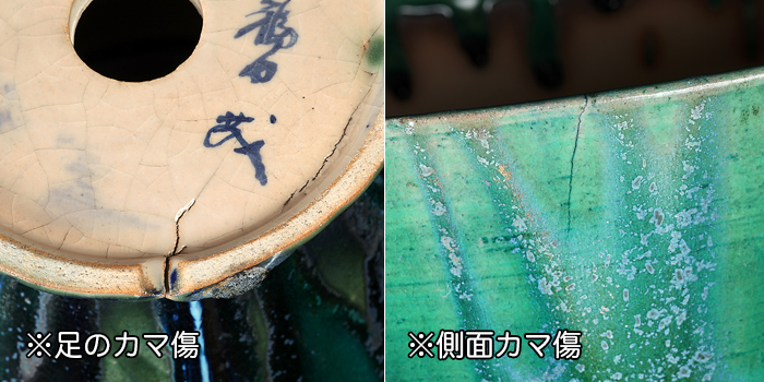 馬上で使う杯をモデルとした盆器には珍しい型で、モダンな植栽や飾りを楽しめる逸品。裏薬も施釉された丁寧な作りです。福茂の遊び心溢れた珍品です。足や縁から内縁にかけて制作時に出来た薄いカマ傷がありますが使用には問題ありません。落款:福田茂