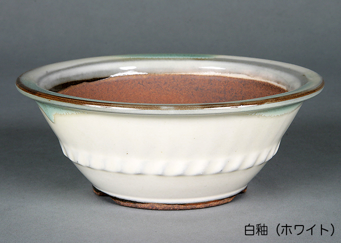胴縄の意匠を施したデザイン性に富んだ丸鉢。少し大きめのサイズで本格的な小品から貴風盆栽、山野草なら大株や寄せ植えに使えます。釉薬は白釉・緑釉・海鼠釉の3色がございます。
