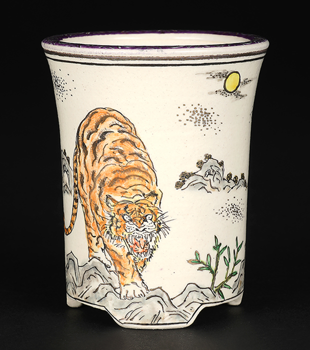 あの月之輪正泉氏の誘いを受け、第43回雅風展を参観。盆栽鉢の世界を肌身で知る。顔見知りの盆栽業者の薦めもあり、2018年立春より鉢作りへの挑戦を決める。それも正泉氏が得意とする染付や赤絵ではなく、金彩を用いる「京薩摩」の再現。薩摩焼の金襴手技法に京焼の瀟酒な意匠を織り込み、明治期に世界に名を馳せたスタイルである。そして近代盆栽2018年9月号で衝撃のデビューを飾り、2019年「第14回現代小鉢作家展」において絵付の部で金賞を受賞。一躍注目の作家となる。